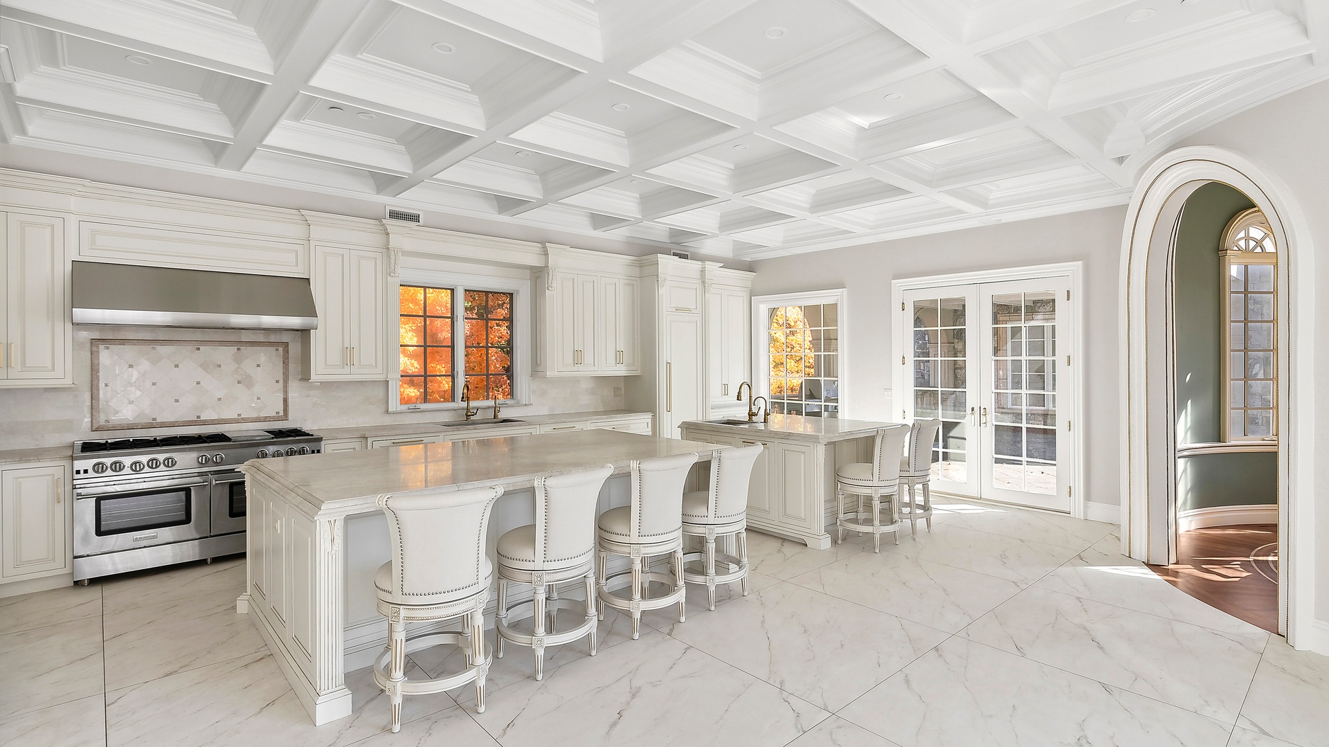 The kitchen has been fully reimagined, combining white marble surfaces, bespoke cabinetry, and professional-grade appliances.