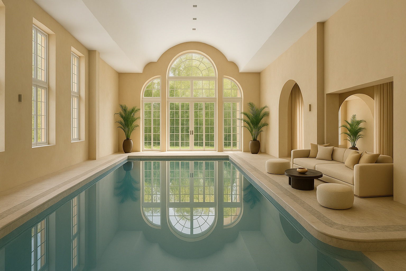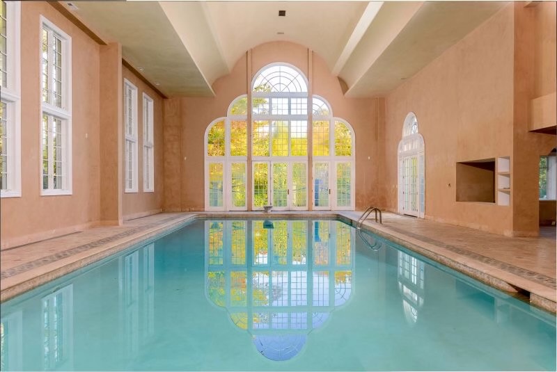 Amenities are comprehensive and discreetly integrated, including indoor and outdoor pools, a screening room, sauna and steam facilities, wine storage, fitness spaces, racquetball court, and a night-lit tennis court.