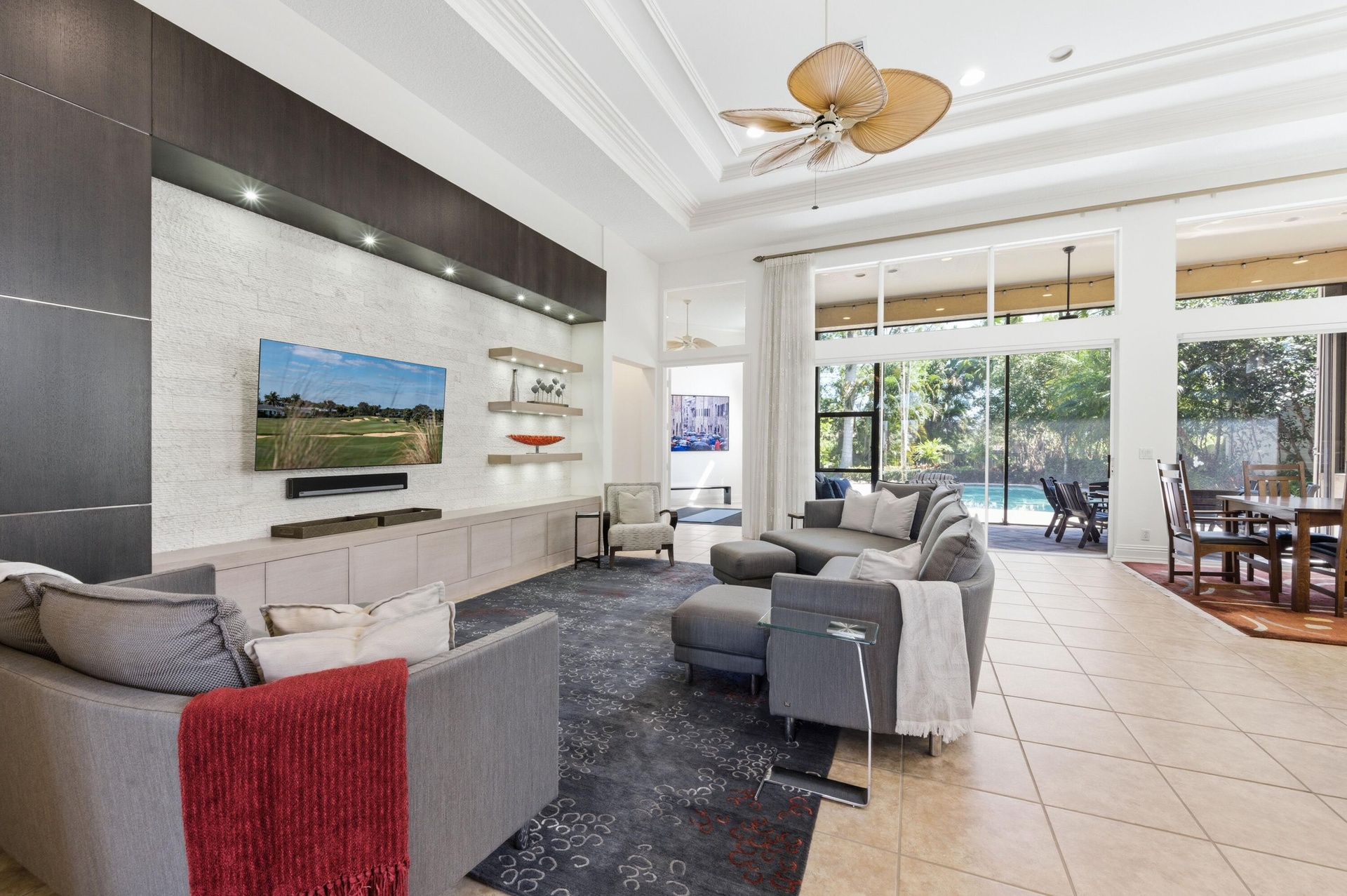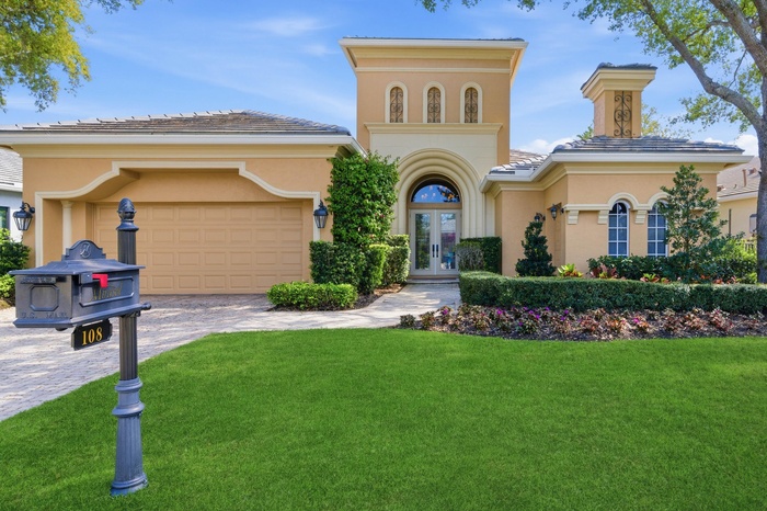 Beautiful single-story 3 bedroom 4.5 bath home on Via Paradisio in Mirasol Country Club. Steps to the clubhouse, amenities, golf, tennis and the new indoor pickleball courts in construction right now. Large great room, 3 bedrooms + office, 4.5 baths, formal dining, plus a den, 2.5-car garage and a new 2024 roof.Large open rooms , kitchen with island seating, family room with custom built-ins, primary bedroom with his and her bathrooms, dual closets , his bath can serve as a cabana bath as well for the pool. the secondary bedrooms have ensuite bathrooms. and a half bath for guests in hallway. This home was well thought out for ultimate entertaining. Relax in your screened in porch, summer kitchen , and large pool in a very private yard. Updated plumbing, and smart water system.