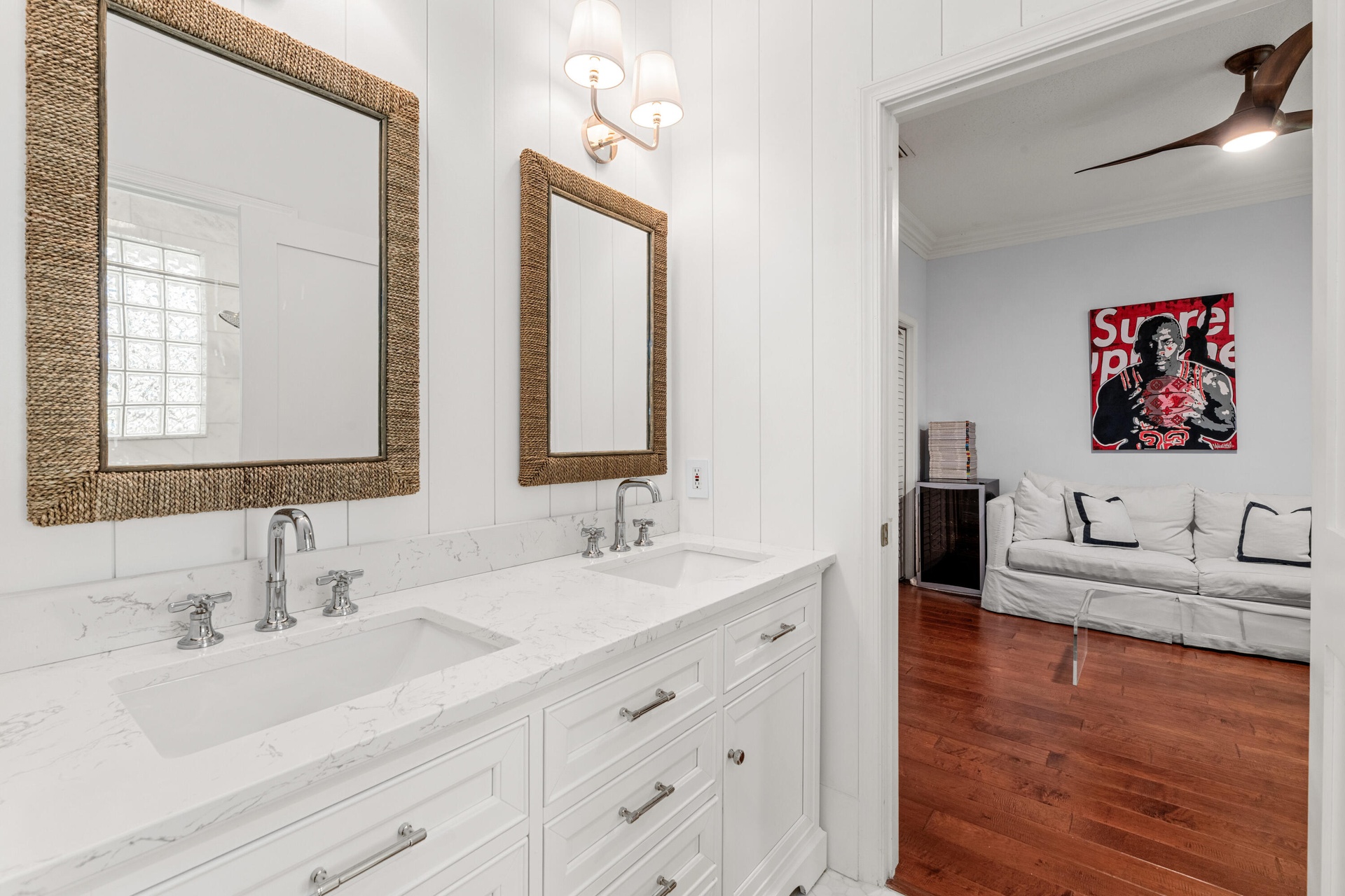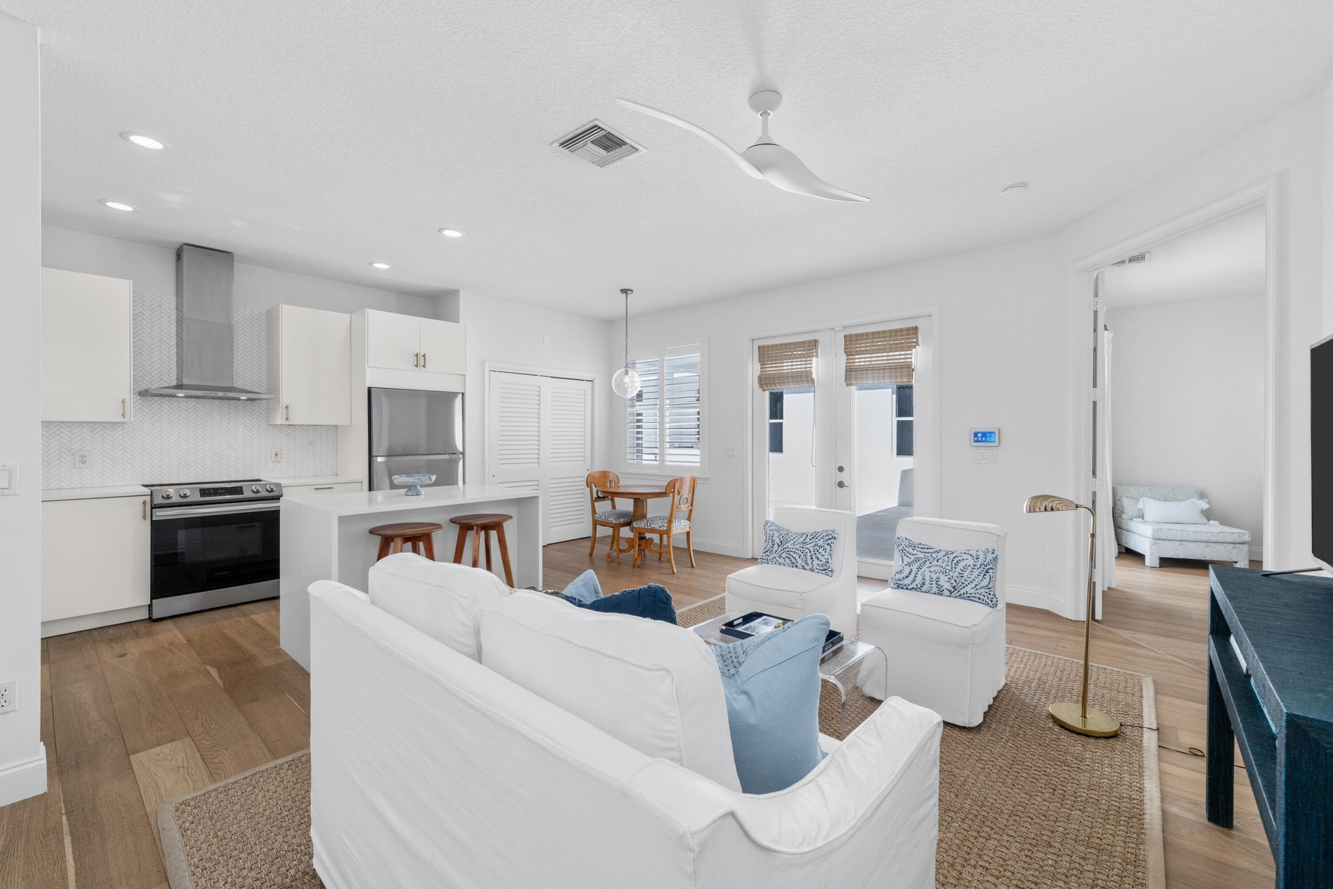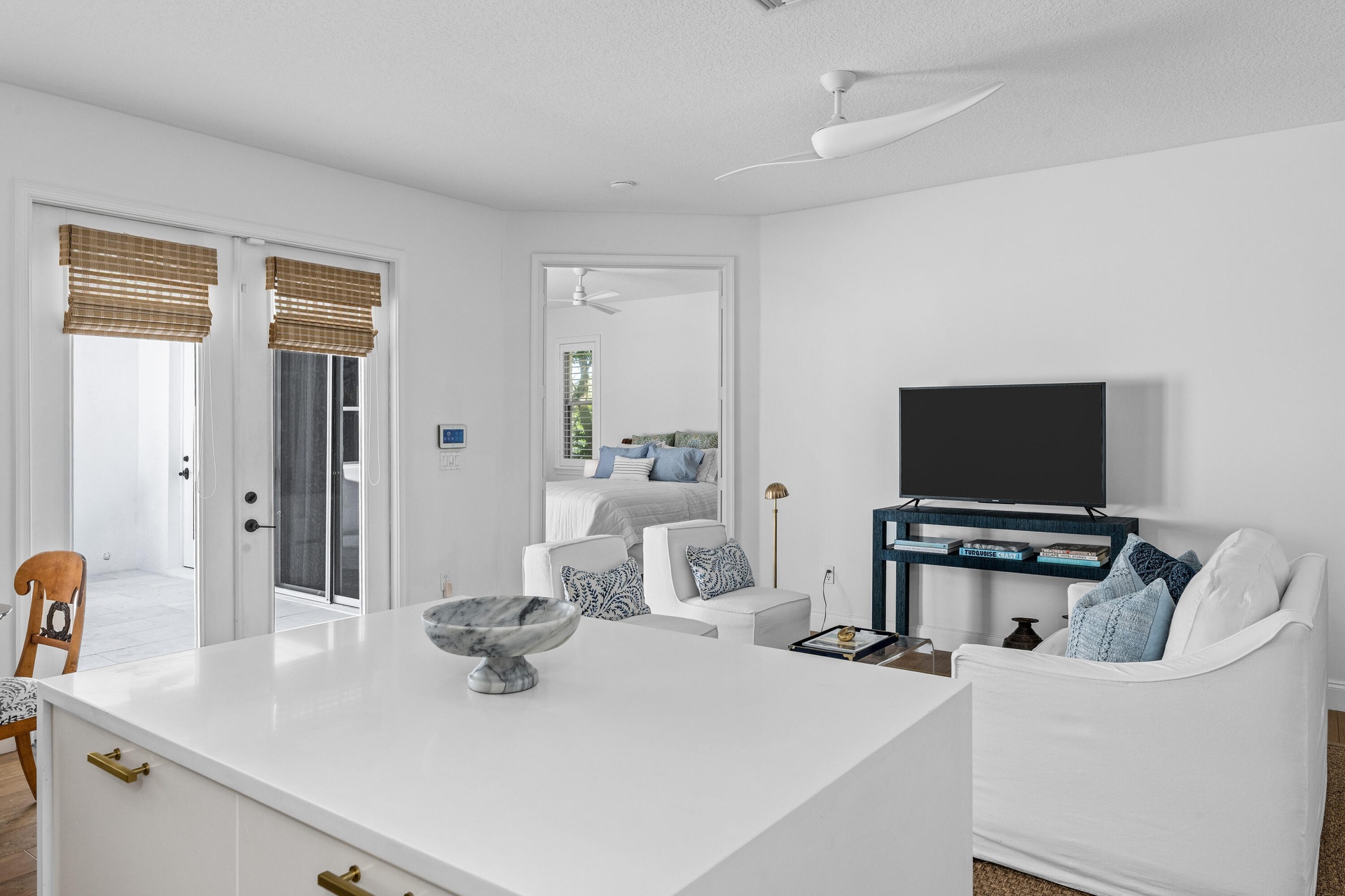 The guest house overlooks the main residence and opens directly onto the pool and patio. It includes a spacious sitting area, full kitchen, dining space, and breakfast bar, making it perfect for visitors or extended stays.