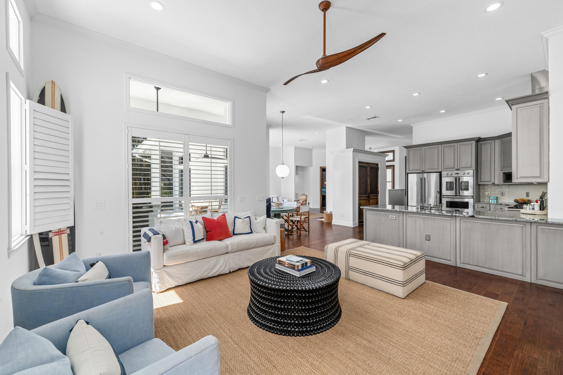 The bright, four-bedroom main residence features an open floor plan with sweeping views of the pool and expansive yard. The family room connects seamlessly to the kitchen, which includes a generous seating area ideal for movie nights and gatherings.