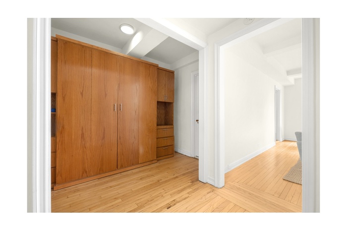 From the moment you enter, radiant southern light floods the generously proportioned living room and windowed kitchen, both overlooking the building's serene garden. The layout is thoughtfully designed to offer the comfort and flexibility of a one-bedroom - the sleeping alcove features a custom Murphy bed with exceptional built-in storage, keeping the space open and airy. Three closets, including a walk-in, provide the kind of storage rarely found in a studio. A lovely, updated bathroom completes this exceptionally well-appointed home.