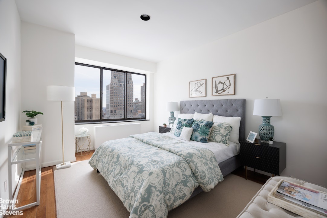 sweeping south- and west-facing views from the expansive double-length living room measuring 29'2" x 20'5". The living room is ideal for both entertaining and relaxing, complete with a chic bar area and striking views of the cityscape. The serene primary suite features its own private balcony and an en-suite five-fixture bathroom. Also on this level are 2 additional generously sized east-facing bedrooms-one with its own balcony-along with 2 full bathrooms, ample closet space, and an in-unit washer and dryer.