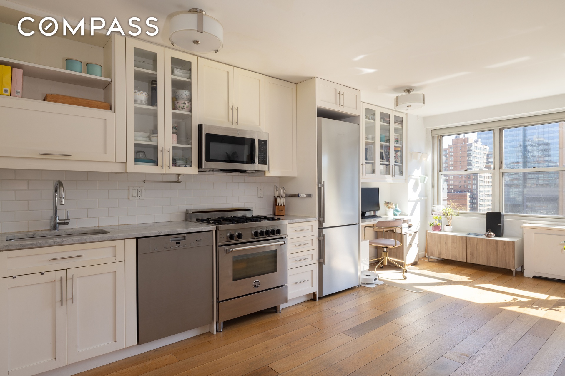 The time to enhance your life has arrived. Bright, beautifully renovated corner two-bedroom, two-bath residence at Riverview East offering abundant natural light from southern and eastern exposures. The expansive living and dining area is ideal for both relaxing and entertaining, seamlessly connected to a thoughtfully designed open kitchen. Outfitted with premium appliances—including a Liebherr refrigerator, Bertazzoni range, and Miele dishwasher—the kitchen also features elegant Carrara marble countertops and a built-in workspace for added functionality.