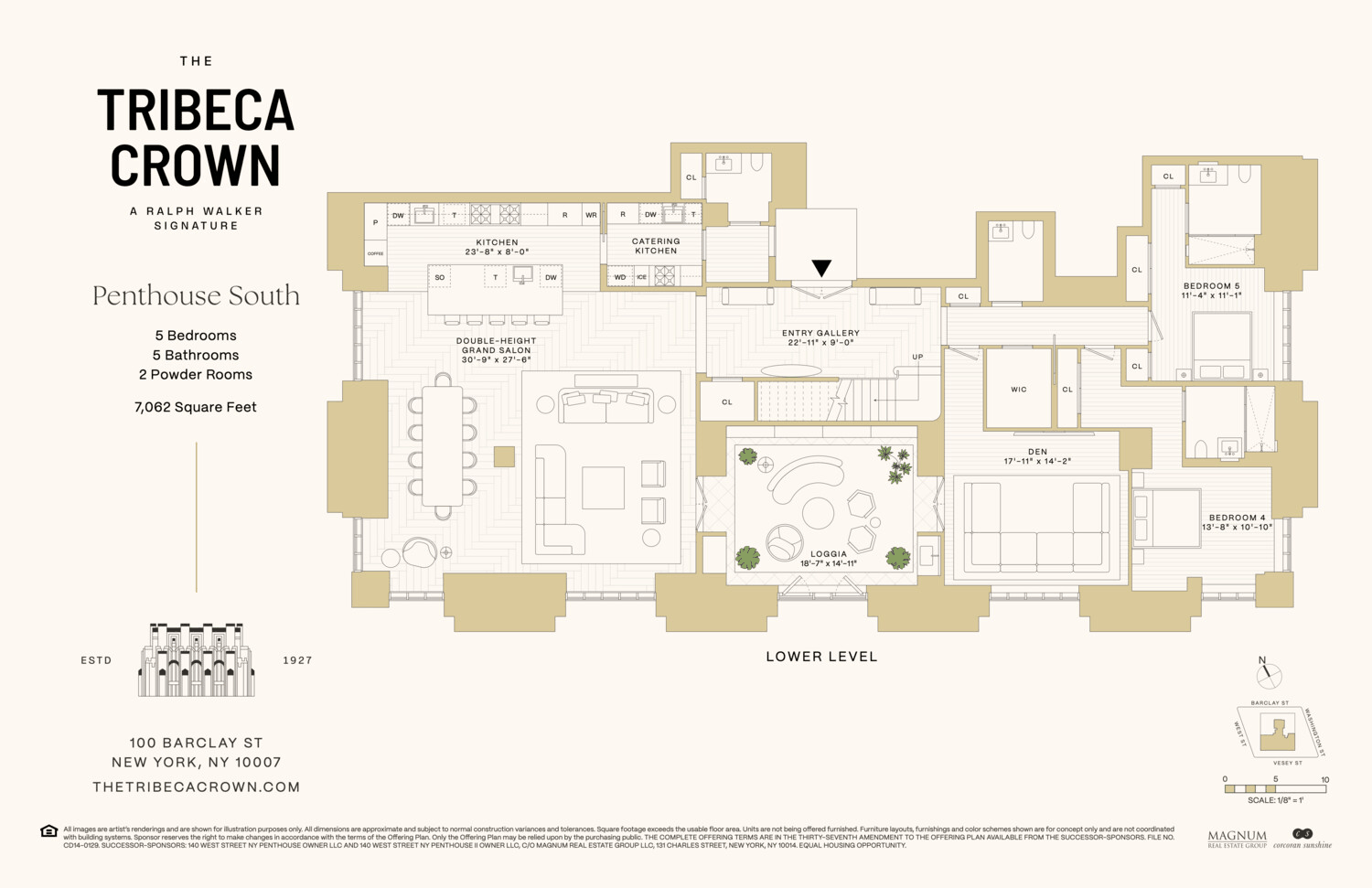THE TRIBECA CROWN A RALPH WALKER MASTERPIECE Penthouse South at One Hundred Barclay is a 7, 062 square foot duplex of exceptional scale and character, offering a rare opportunity to ...