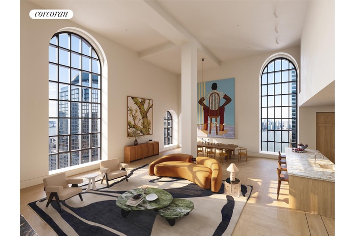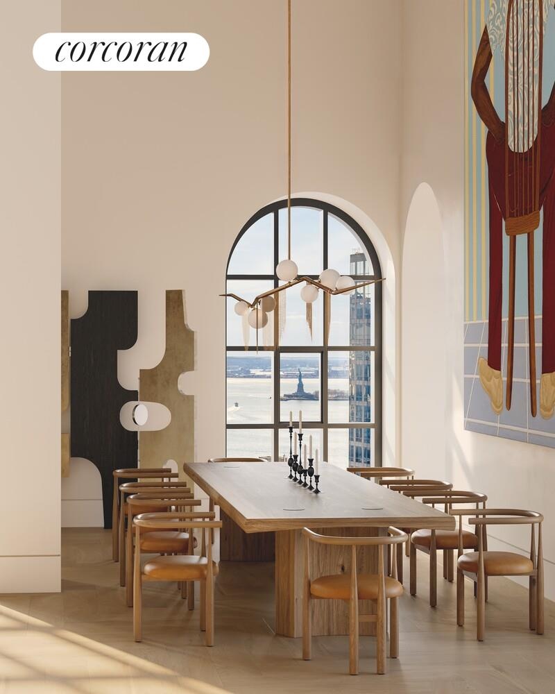 Penthouse South at One Hundred Barclay is a 7,062-square-foot duplex of exceptional scale and character, offering a rare opportunity to own a turnkey Paris Forino-designed residence in Tribeca. The home features five bedrooms, five bathrooms, two powder rooms, and a private loggia, with abundant natural light from south, east, and west exposures. Sweeping views of the Hudson River and the Statue of Liberty provide a dramatic backdrop to the residence's monumental great room, where 21-foot ceilings and gallery-scale art walls create architectural volumes seldom found in new developments and typically reserved for the city's most celebrated prewar penthouses.
