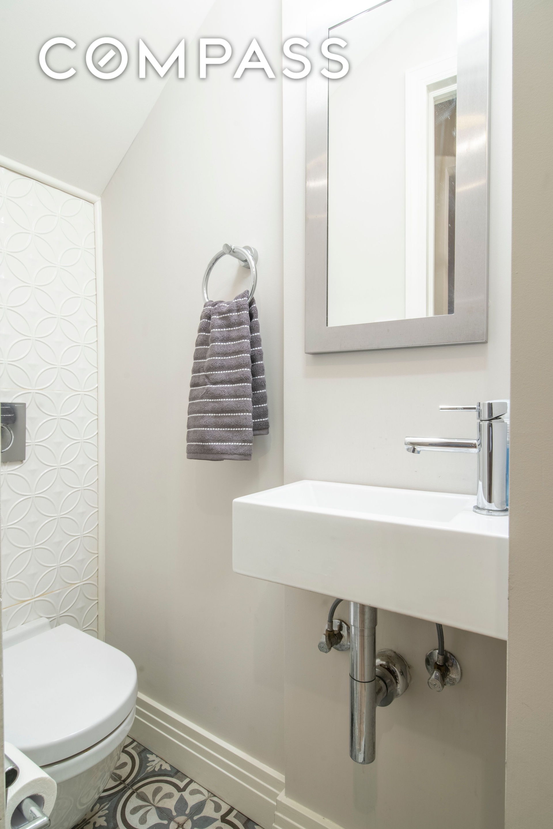 The upper floor features a primary suite with ensuite bathroom, a well-proportioned second bedroom, and a stylish guest bath. The unit also has a half bath on the first floor. A newly installed, fully vented washer and dryer add to the convenience. Generous closet space and thoughtful storage solutions are found throughout the home.
