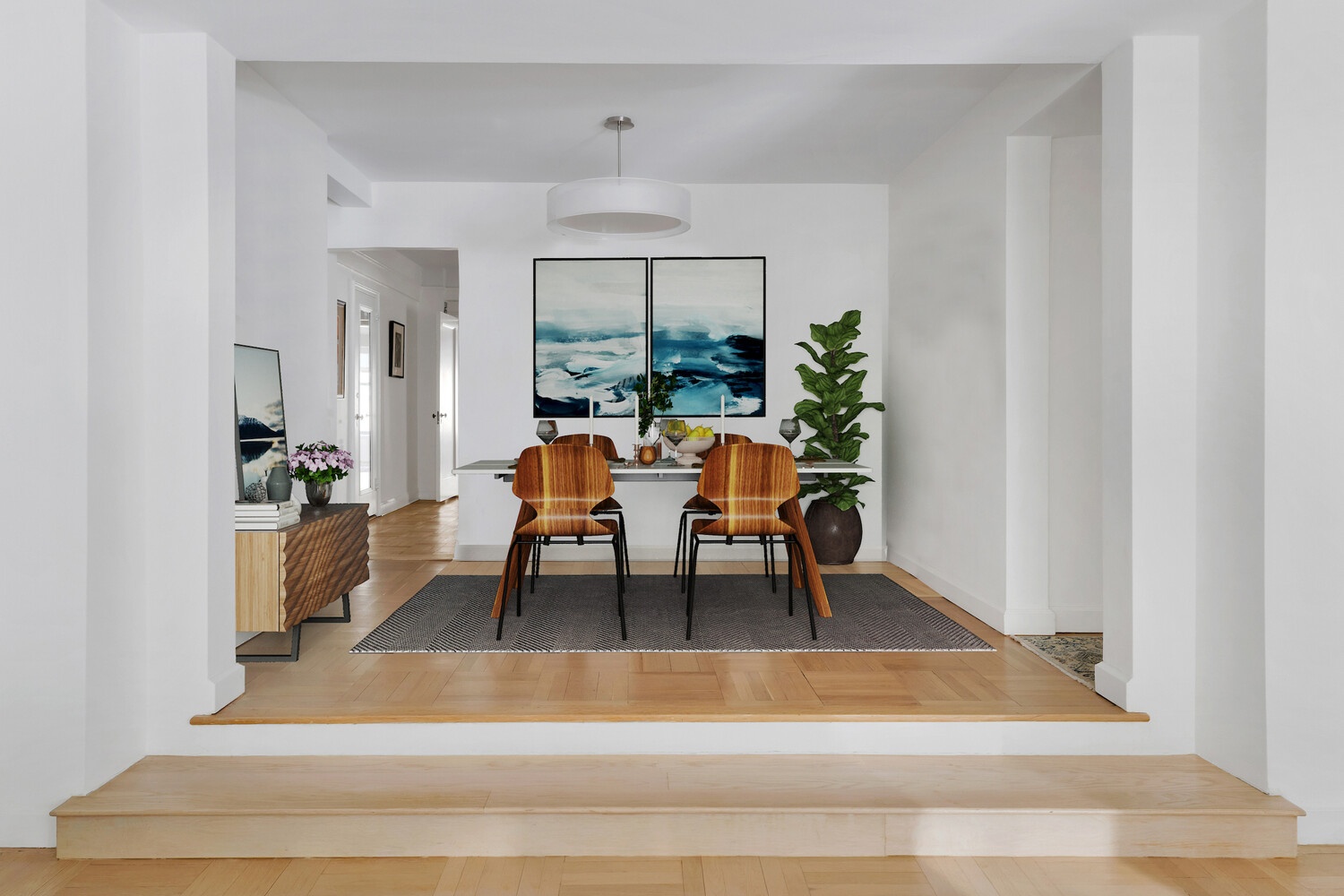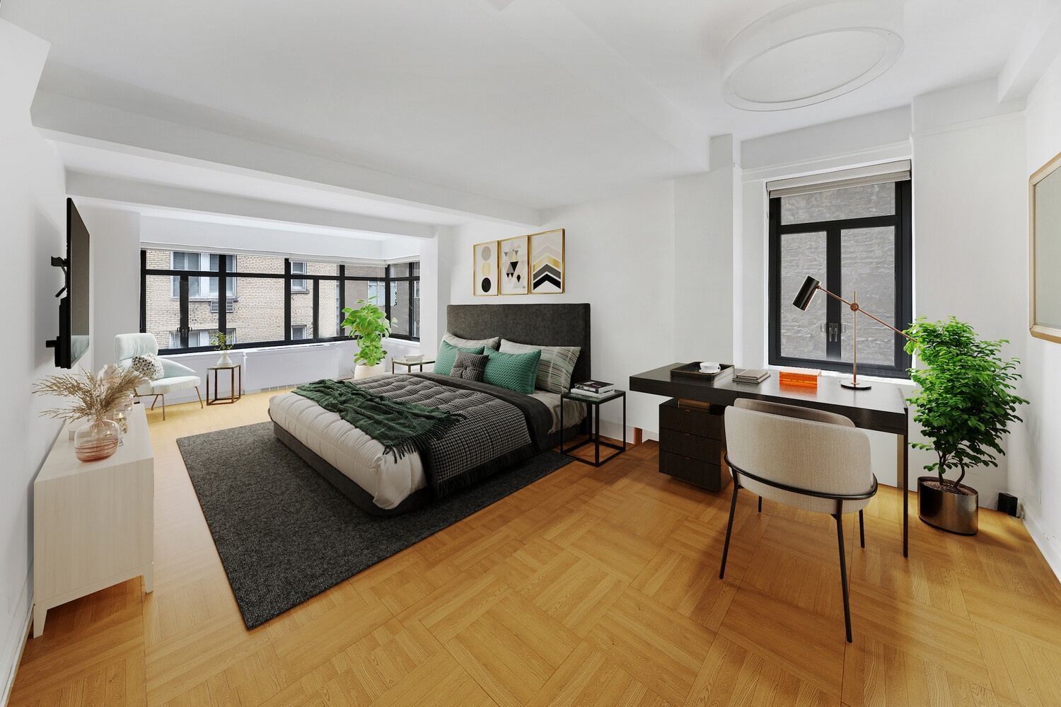 An elegant entry foyer opens into a grand living and entertaining space, defined by beautiful hardwood floors, soaring 9-foot beamed ceilings, and oversized steel-framed windows with open southern views overlooking the Abby Aldrich Rockefeller Sculpture Garden. Designed for both sophisticated entertaining and intimate everyday living, Residence 7C is equally suited as a striking showpiece and a serene private retreat.