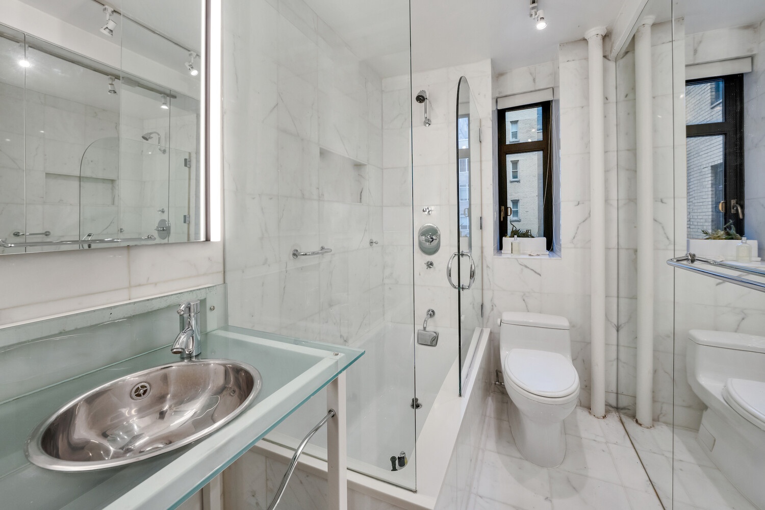 A second full bathroom with marble-tiled walls serves the northern wing. The residence is completed by abundant closet space throughout and an in-unit washer and dryer.