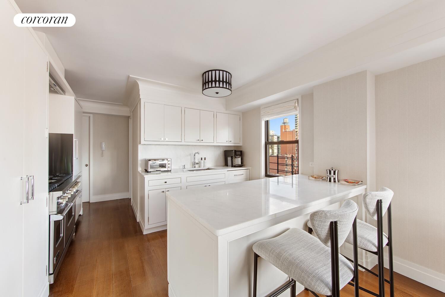 The kitchen is equipped with a Viking six-burner range with griddle and double ovens, Sub-Zero refrigerator, Miele dishwasher, and Wolf microwave drawer. Marble countertops and backsplash, substantial cabinetry, and counter seating complete the space. A full windowed bath is located directly off the hall beside the kitchen.