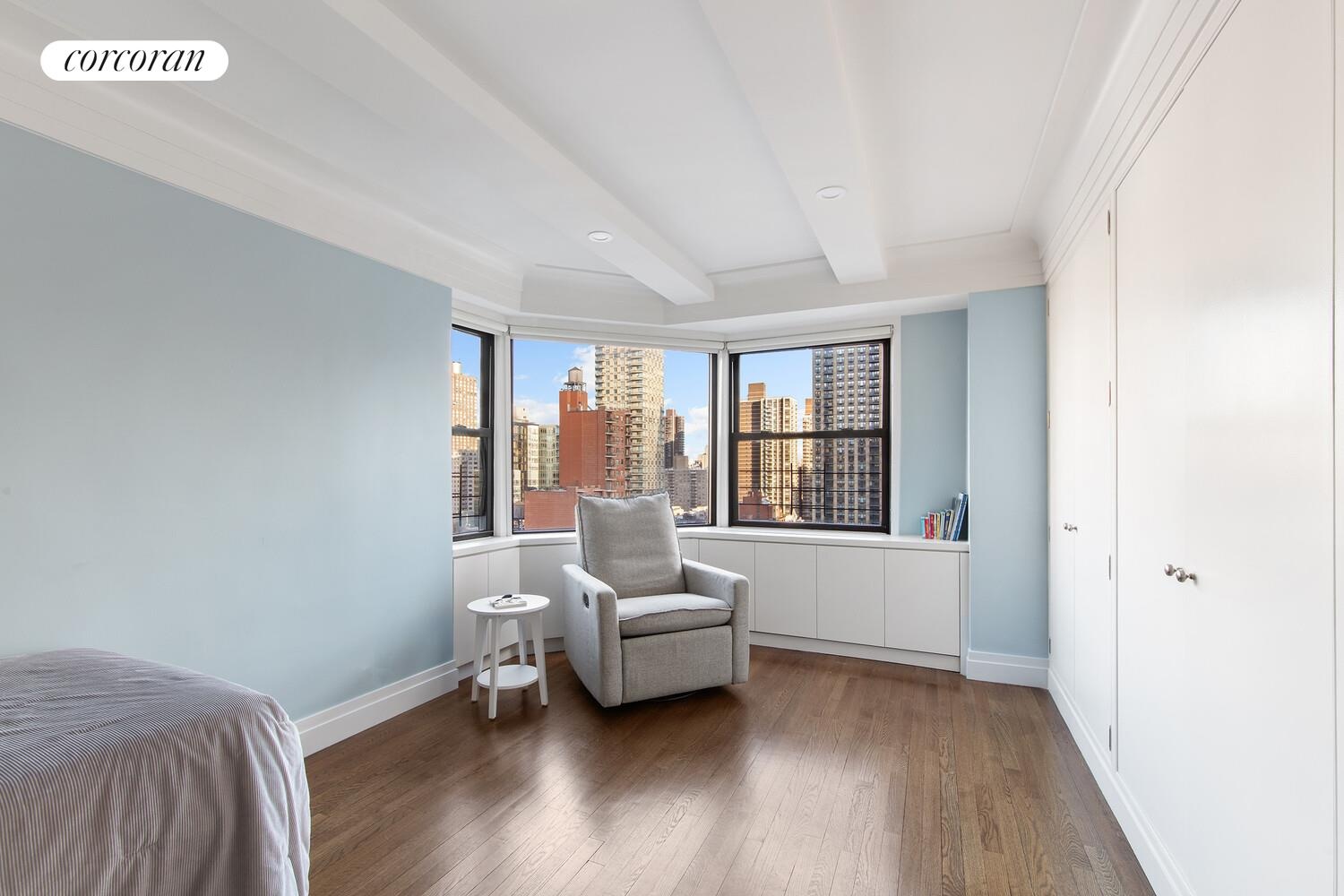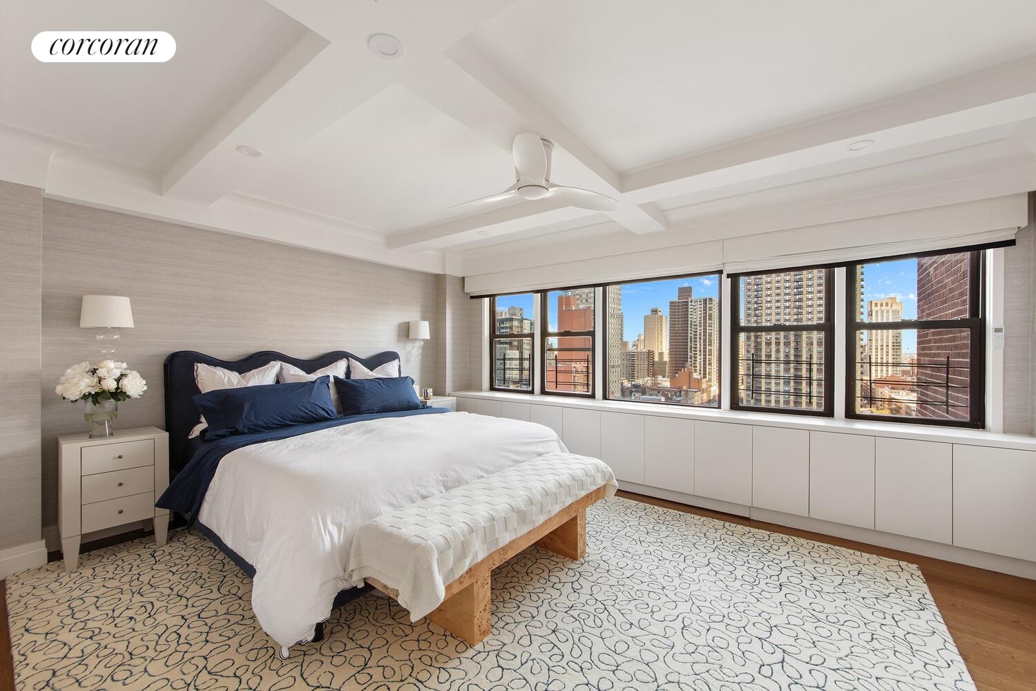 A proper foyer leads into a 24-foot living room and a corner dining area wrapped in windows with city views. The dining space includes built-in banquette seating with storage and recessed lighting.