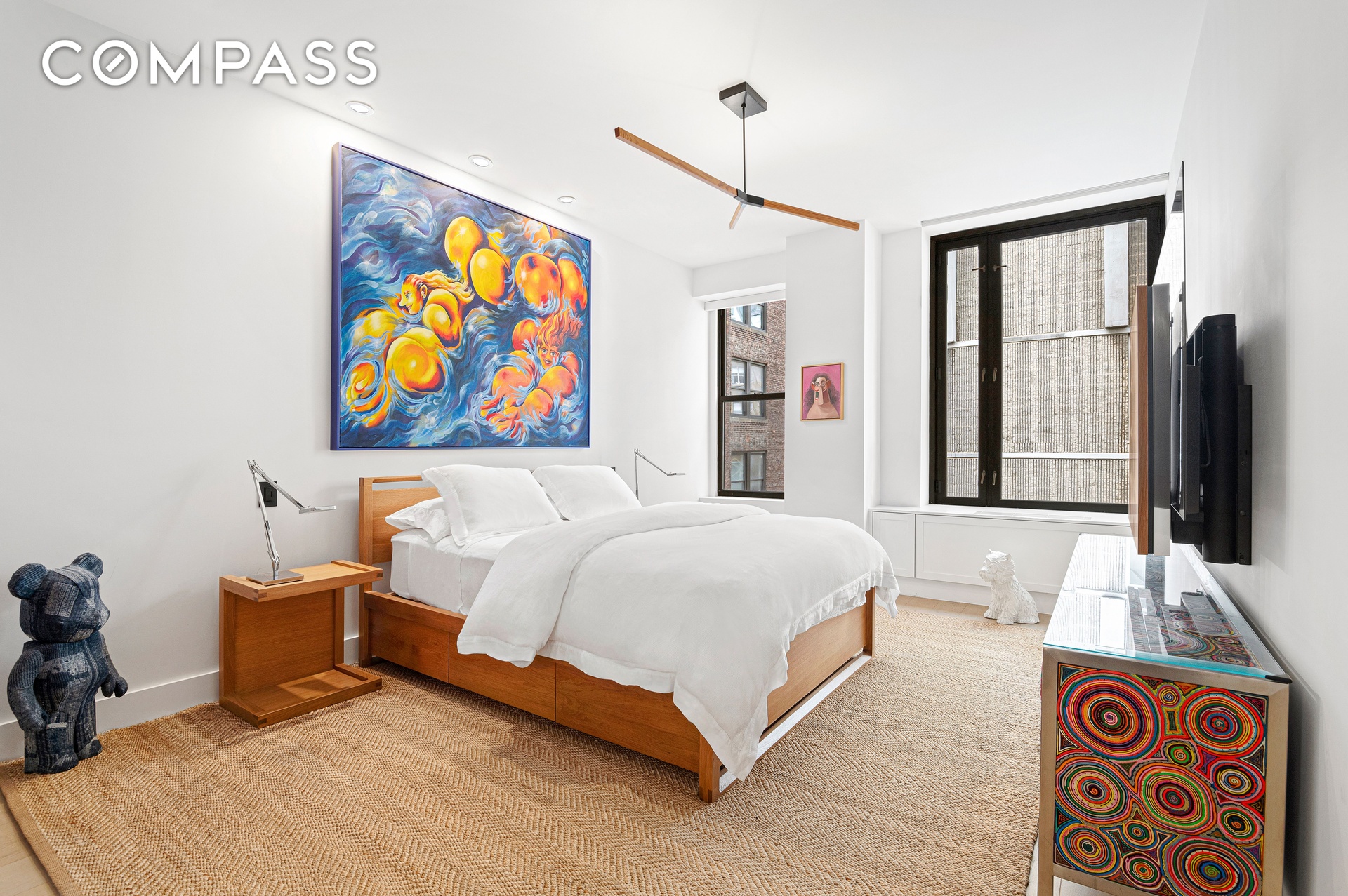 The primary suite is a palatial retreat that easily accommodates a California King with room to spare. North-facing windows offer abundant light and a peaceful separation from neighboring buildings. The spa-like en-suite bath boasts a double vanity, a glass-enclosed shower with a deep soaking tub, wall hung toilet, and premium fixtures. A massive, custom-outfitted walk-in closet completes the suite.