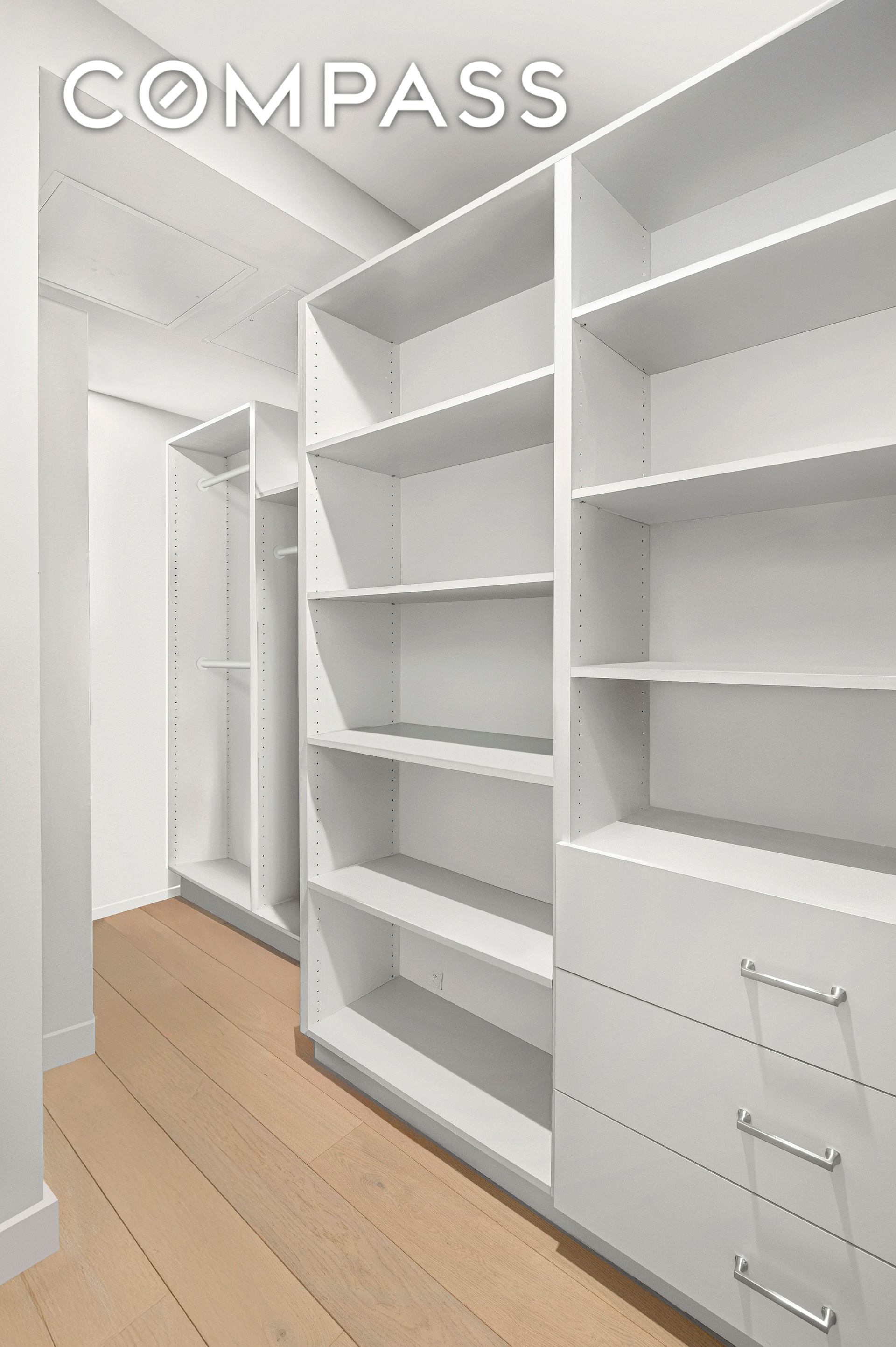 The large second bedroom has an oversized closet and windows with both southern and western exposures. This flexible space can house 2 twin beds, or a queen bed, both with additional furniture. It currently serves as a huge world-class dressing room with extensive custom storage and shelving for the current owners. Luxury at its best.