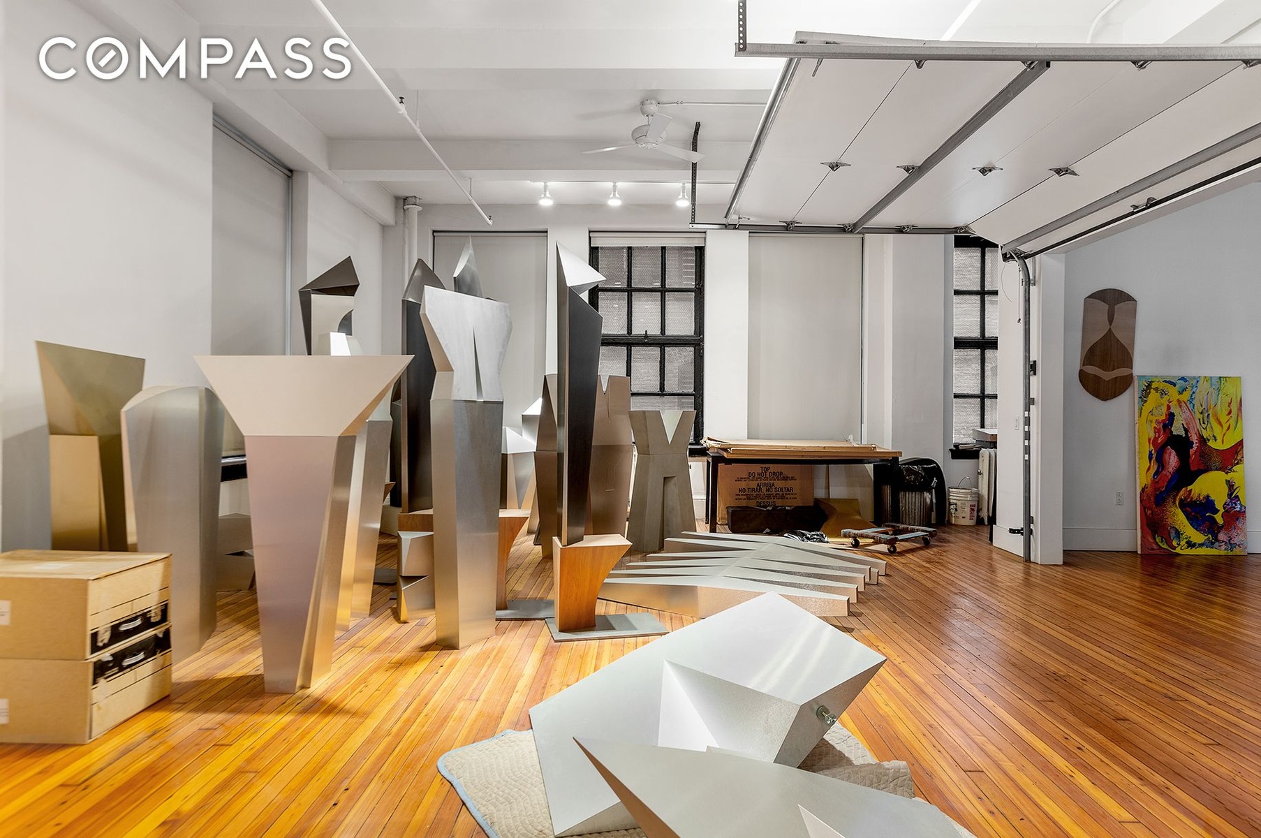 Featuring two private elevator entrances, the loft is currently set up as an artist's studio plus large primary bedroom. The enormous space boasts an open layout and beautifully refinished original hardwood floors throughout. A wall of windows faces north bathing the apartment in sunlight and featuring open city views. The open kitchen features custom cabinetry and updated appliances, and is situated in the center of the loft - there is excellent potential for an eat-in kitchen and an expansive dining area.