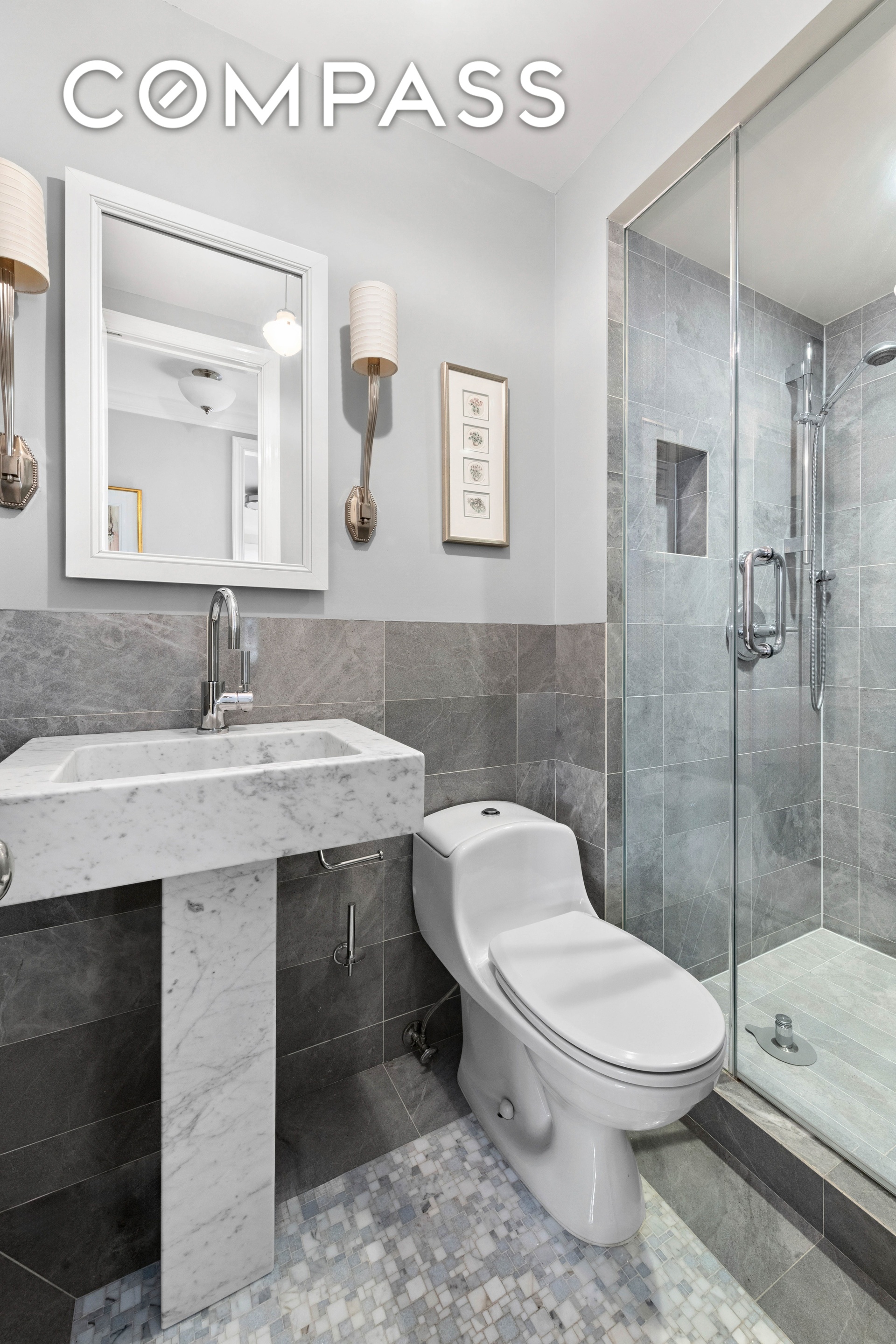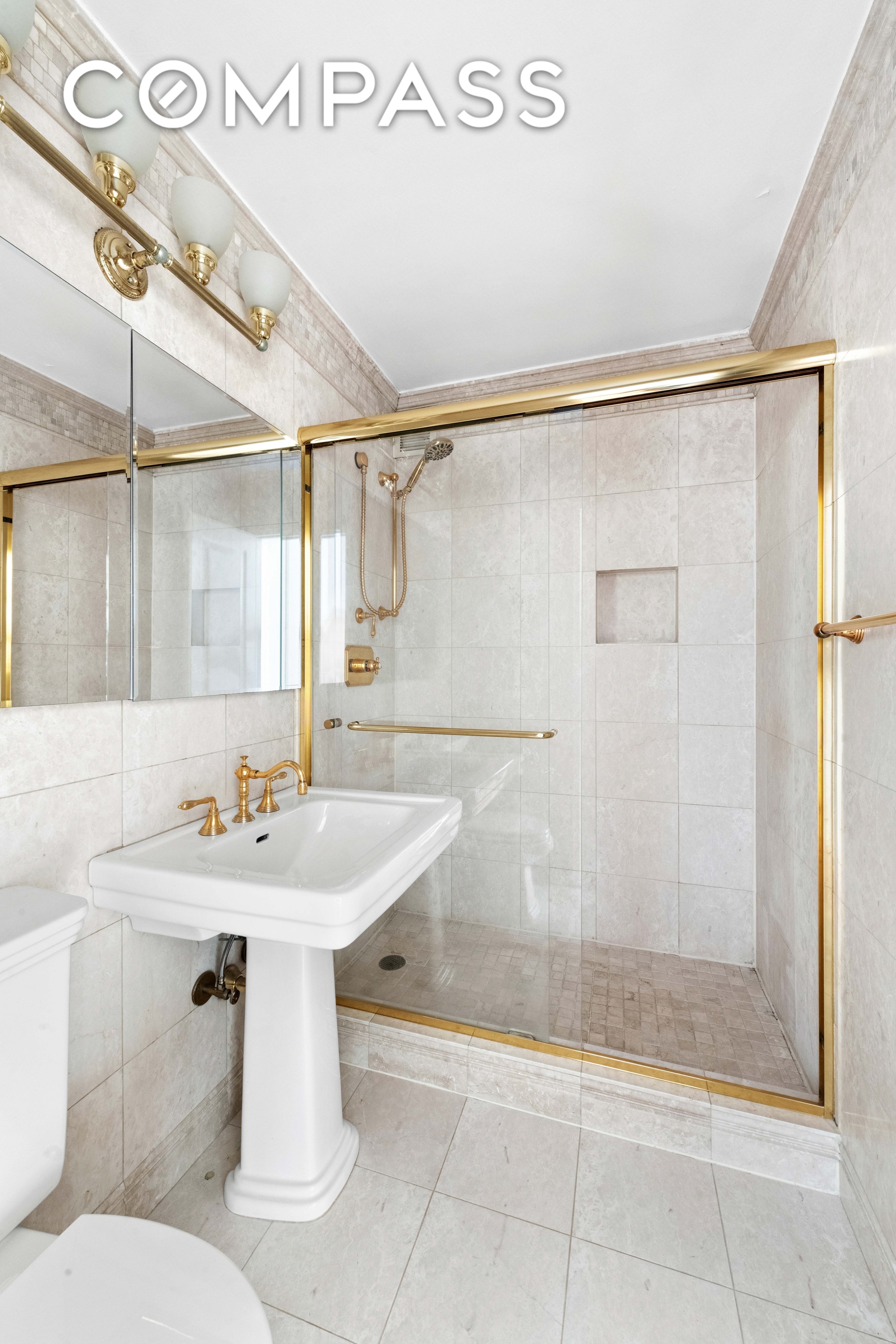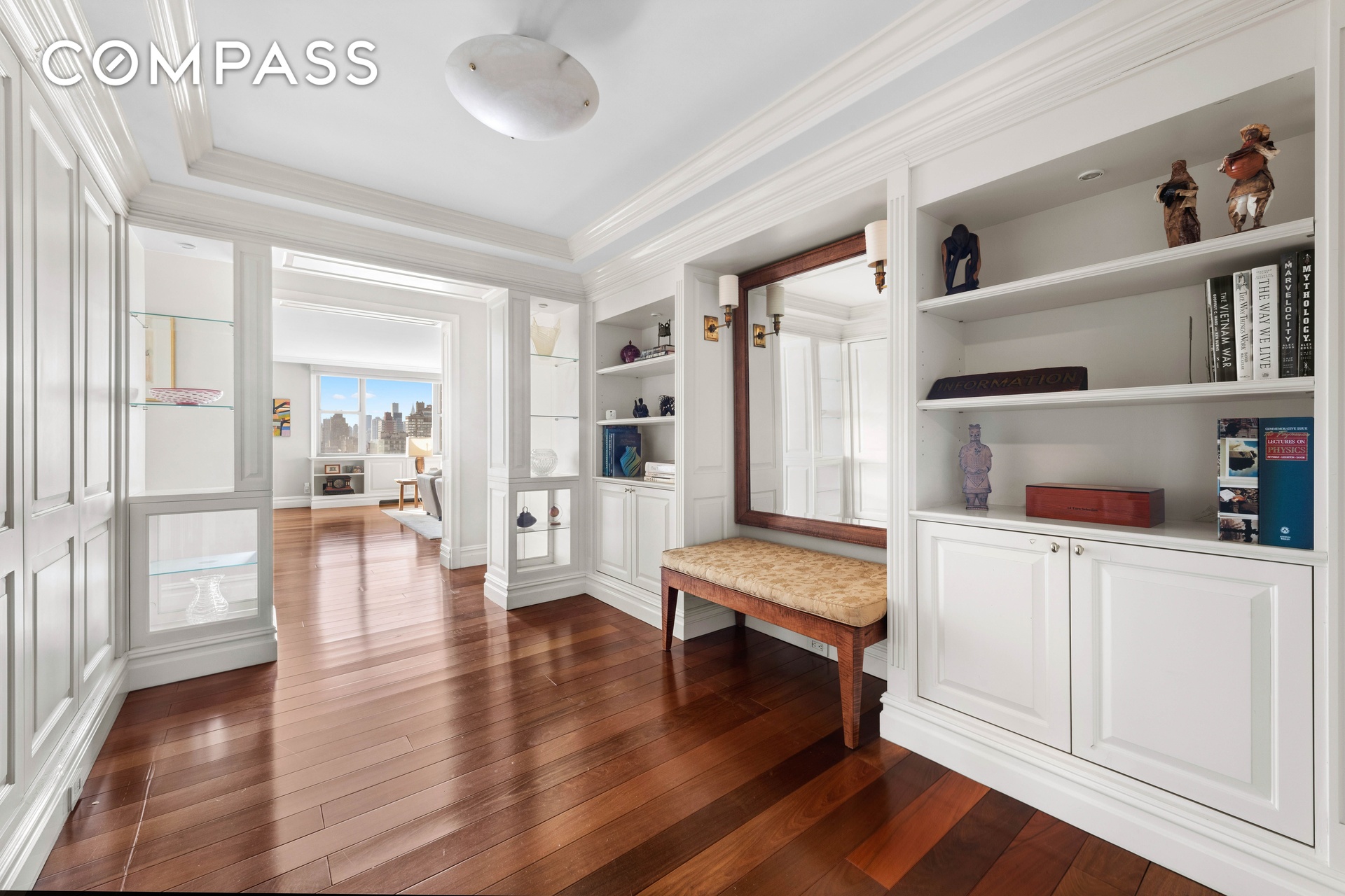 The larger primary bedroom suite includes a beautifully designed extra large walk-in closet, dressing room and a renovated ensuite bathroom. The second en-suite bedroom is equally impressive, featuring its own full bath and an oversized closet. A third full bathroom is accessed from the hallway, thoughtfully positioned for guest use.Custom built-ins and abundant closets are found throughout the apartment.