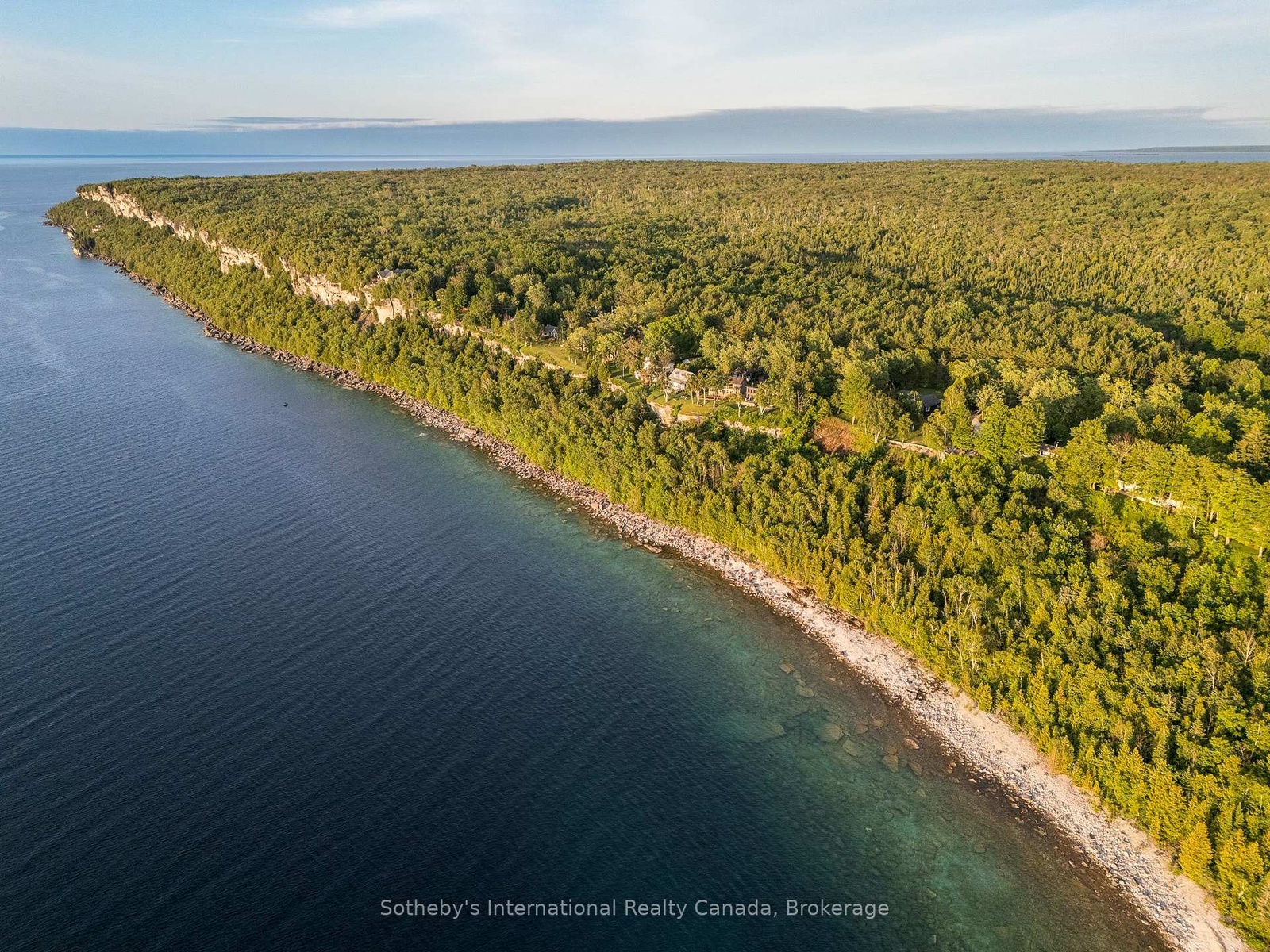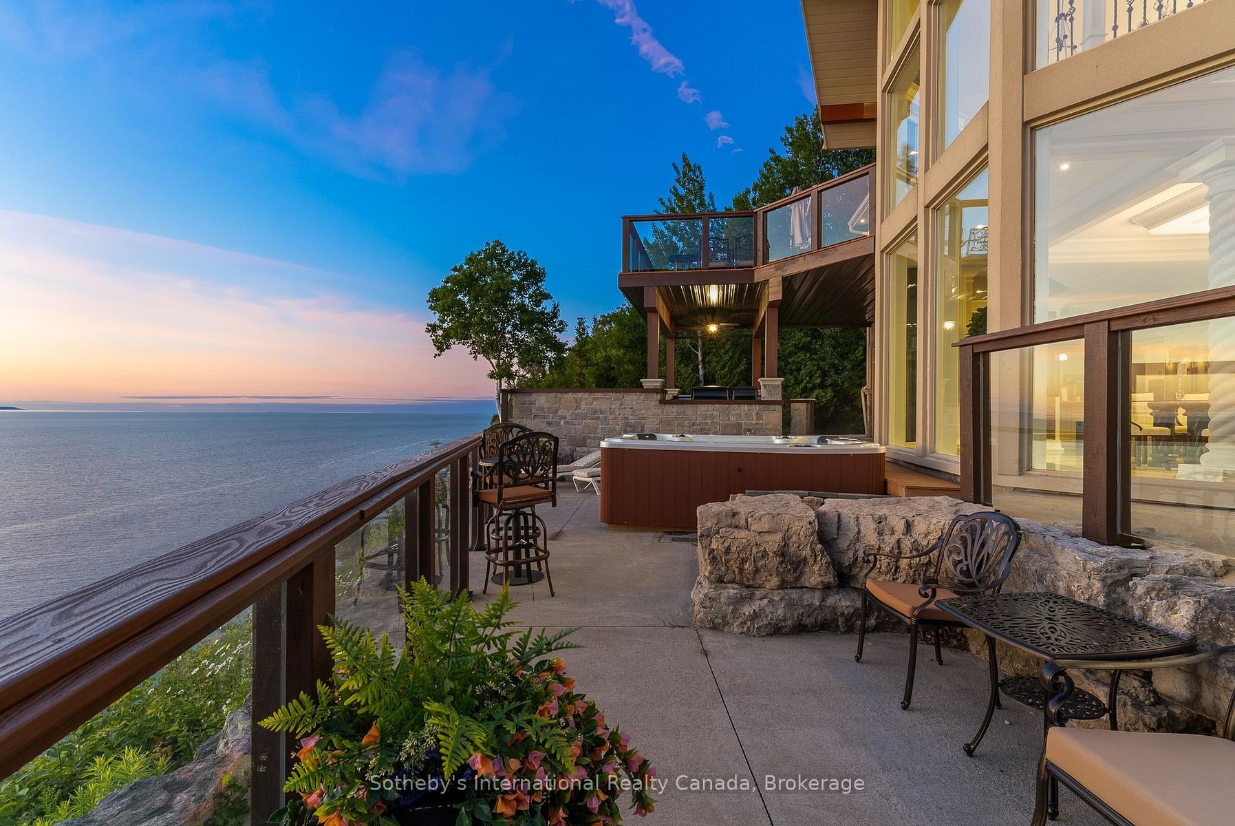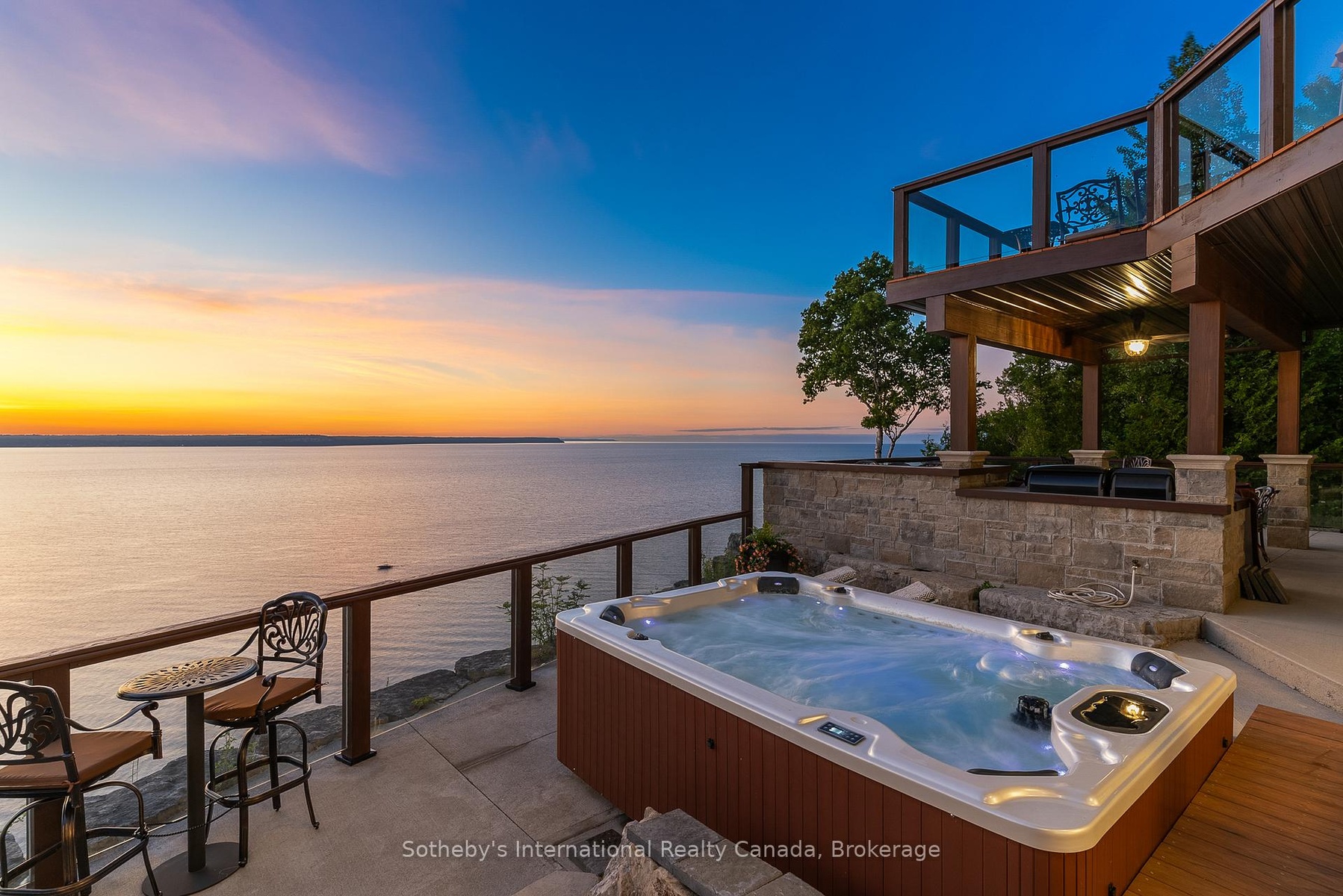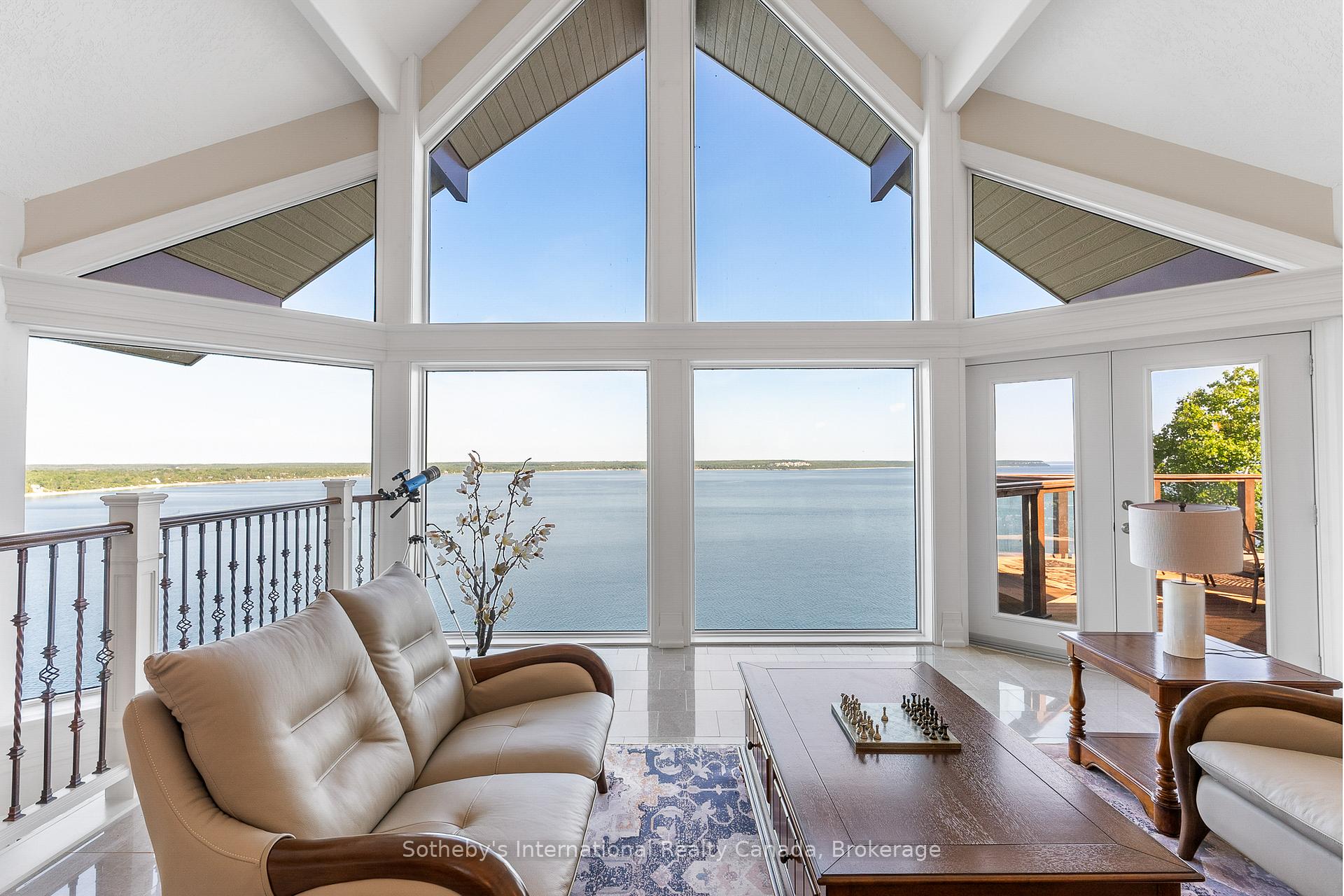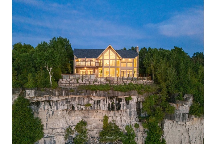 The Peninsula Perch is a 6,418 sq ft cliffside masterpiece perched 300 ft above the turquoise waters of Georgian Bay, offering nearly 4 km of uninterrupted northwest-facing views and world-class sunsets over Whippoorwill Bay. This architectural feat features R45 ICF construction from foundation to trusses, topped with a timeless slate roof and a concrete driveway leading to a triple-car garage with heated floors and EV charger rough-in. Inside, the great room boasts soaring 33-ft ceilings anchored by solid marble pillars and a grand fireplace with a custom marble mantle, while the mezzanine sitting area and primary bedroom balcony offer a front-row seat to the escarpment. The professional chef's kitchen is equipped with a large island induction cooktop with a pop-up air vent, a walk-in pantry, four Sub-Zero fridge/freezer units, two dishwashers, and an ice maker. Designed for comfort and efficiency, the home features radiant heated floors throughout and the convenience of primary bedroom laundry. Complete privacy with an acre to the left of protected association land and 13 acres to the right of Crown land. Street access to the Bruce trail.The outdoor living space is a maintenance-free oasis with a covered porch, large hot tub, and high-end AstroTurf grounds, all situated in a designated Dark Sky community just 30 minutes from the 5,000-ft runway at Wiarton Keppel International Airport.