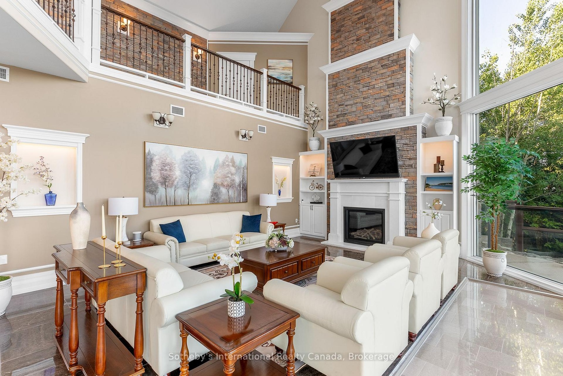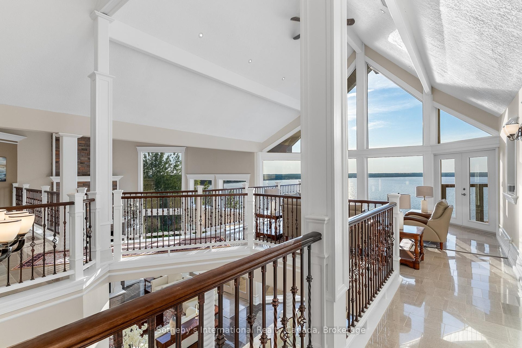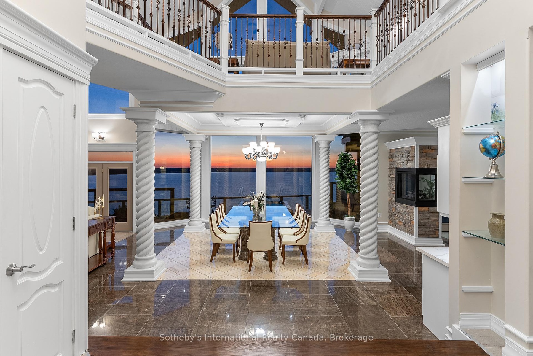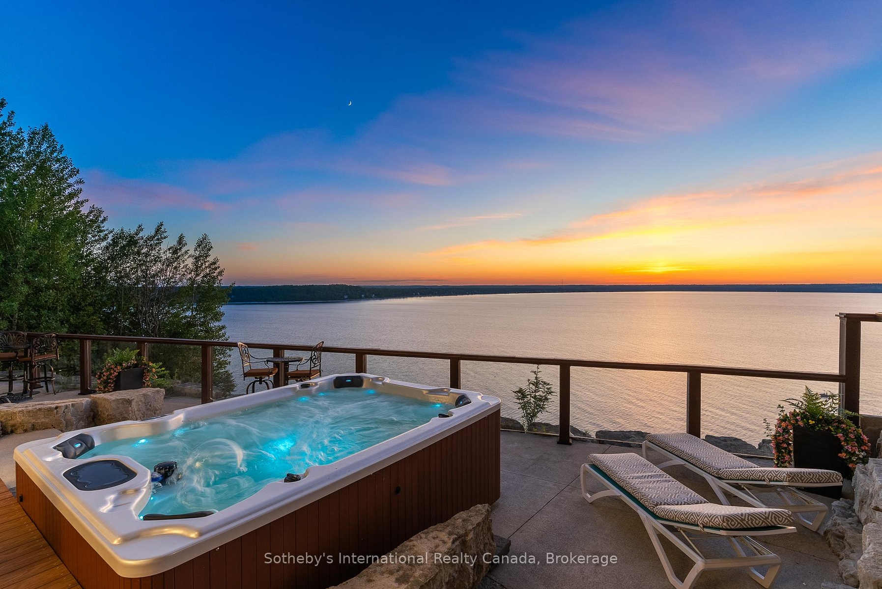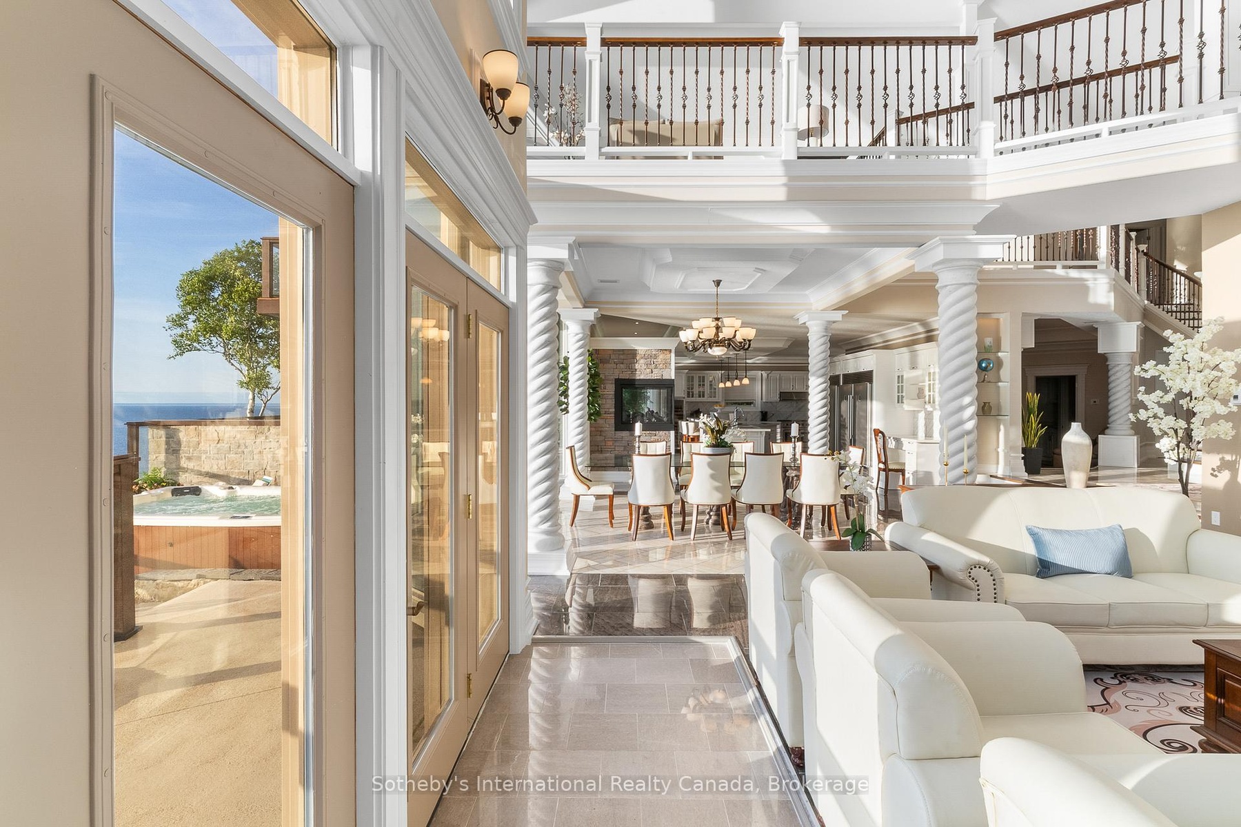 The Peninsula Perch is a 6,418 sq ft cliffside masterpiece perched 300 ft above the turquoise waters of Georgian Bay, offering nearly 4 km of uninterrupted northwest-facing views and world-class sunsets over Whippoorwill Bay. This architectural feat features R45 ICF construction from foundation to trusses, topped with a timeless slate roof and a concrete driveway leading to a triple-car garage with heated floors and EV charger rough-in. Inside, the great room boasts soaring 33-ft ceilings anchored by solid marble pillars and a grand fireplace with a custom marble mantle, while the mezzanine sitting area and primary bedroom balcony offer a front-row seat to the escarpment. The professional chef's kitchen is equipped with a large island induction cooktop with a pop-up air vent, a walk-in pantry, four Sub-Zero fridge/freezer units, two dishwashers, and an ice maker. Designed for comfort and efficiency, the home features radiant heated floors throughout and the convenience of primary bedroom laundry. Complete privacy with an acre to the left of protected association land and 13 acres to the right of Crown land. Street access to the Bruce trail.The outdoor living space is a maintenance-free oasis with a covered porch, large hot tub, and high-end AstroTurf grounds, all situated in a designated Dark Sky community just 30 minutes from the 5,000-ft runway at Wiarton Keppel International Airport.