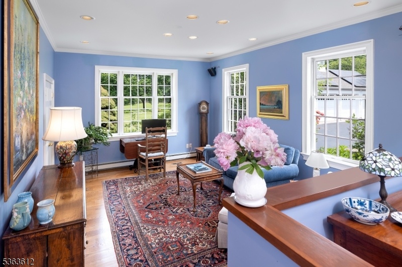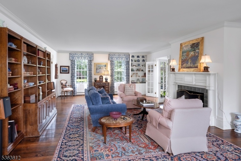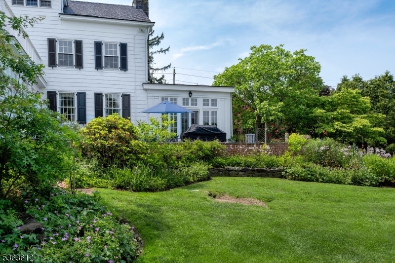 An elegant white 19th century Federal Style Home just 5 miles from Princeton stands on four acres with sweeping views of bountiful gardens, a picturesque pond and park like lawns.