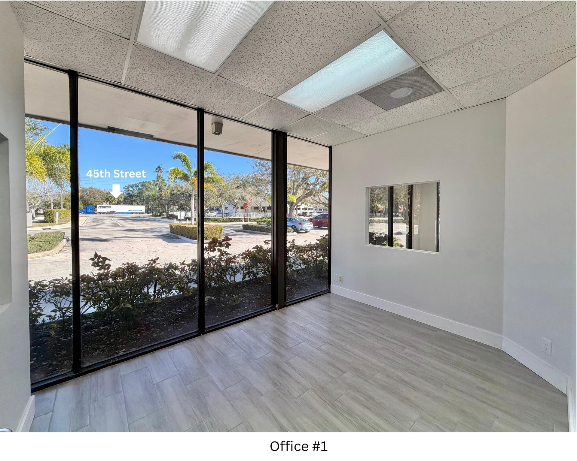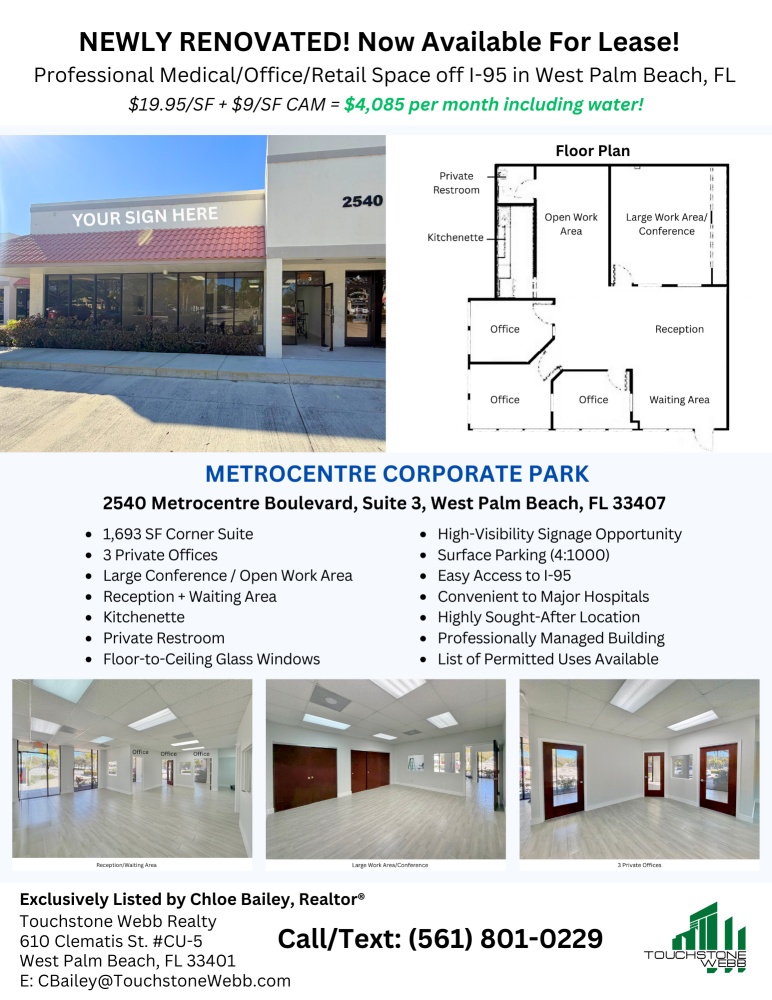 JUST RENOVATED! Gorgeous, light and bright ground-floor professional office space with easy access to I-95, surface parking, and high-visibility signage. Enjoy floor-to-ceiling glass windows in this 1,693 sq.ft. corner unit featuring 3 private offices, a kitchenette and private restroom in suite, a large work area or conference room, reception/waiting area and an open storage or work area. This is a highly sought-after professional business park. Join Palm Beach Prosthetics, Hearts For Moms, Cost Containment Group, DPC Consulting and more in this professionally managed building. Many major hospitals nearby. List of permitted uses available upon request! Call today!