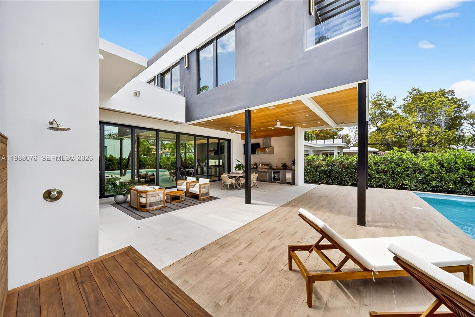 Welcome to Villa Verano, a newly completed (2026) ultra-modern architectural masterpiece offering 5,772 total square feet of construction, featuring 4 spacious bedrooms, a dedicated office, walk-in pantry, two expansive terraces, and a spectacular primary suite. The home also includes a swimming pool, dry sauna, and a spacious garage, combining luxury with functionality.Upon entry, a dramatic pivot door opens to soaring high ceilings and a completely open, column-free floor plan, creating a seamless and unobstructed flow. Floor-to-ceiling glass doors retract into the walls, effortlessly blending indoor and outdoor living, and leading to a fully equipped gourmet outdoor kitchen, ideal for entertaining. Featuring a full concrete roof and enhanced structural reinforcement, fully wired for high-speed internet and security cameras. Ideally located just 0.5 miles from I-95 and approximately 1 mile from Brickell and the future Citadel headquarters, this property offers unmatched access to one of the fastest-growing financial hubs.
