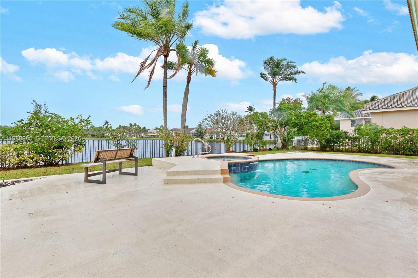 Experience luxury living in this stunning builder’s model home located in the exclusive gated community of Plantation Palms. Perfectly positioned on a premium lakefront lot, this upgraded residence offers breathtaking panoramic water views and exceptional indoor-outdoor living. Inside, you’ll find elegant porcelain tile flooring on the main level and rich solid wood flooring upstairs—(second-floor wood flooring updated 3 years ago)—complemented by custom interior doors and a striking marble wood-burning fireplace with a stylish bar, ideal for entertaining. The fully remodeled kitchen features custom cabinetry, sleek Silestone countertops, and high-end stainless steel appliances. Designed for comfort, convenience, and peace of mind, the home includes all hurricane impact windows and doors, a full standby generator, and integrated wiring for surround sound and a home theater system. Bright enclosed spaces provide flexible options for a home office, playroom, or den. The luxurious primary suite boasts a private dressing area, custom walk-in closet, and a spa-inspired bathroom retreat. Step outside to your own private oasis with a fenced yard, expansive patio, motorized XL awning, heated saltwater pool, and lush landscaping—all overlooking serene lake views. Additional highlights include a roof just 2 years old and a first-floor A/C replaced 4 years ago. This exceptional home offers the perfect blend of elegance, functionality, and the ultimate Florida lifestyle. A true must-see!
