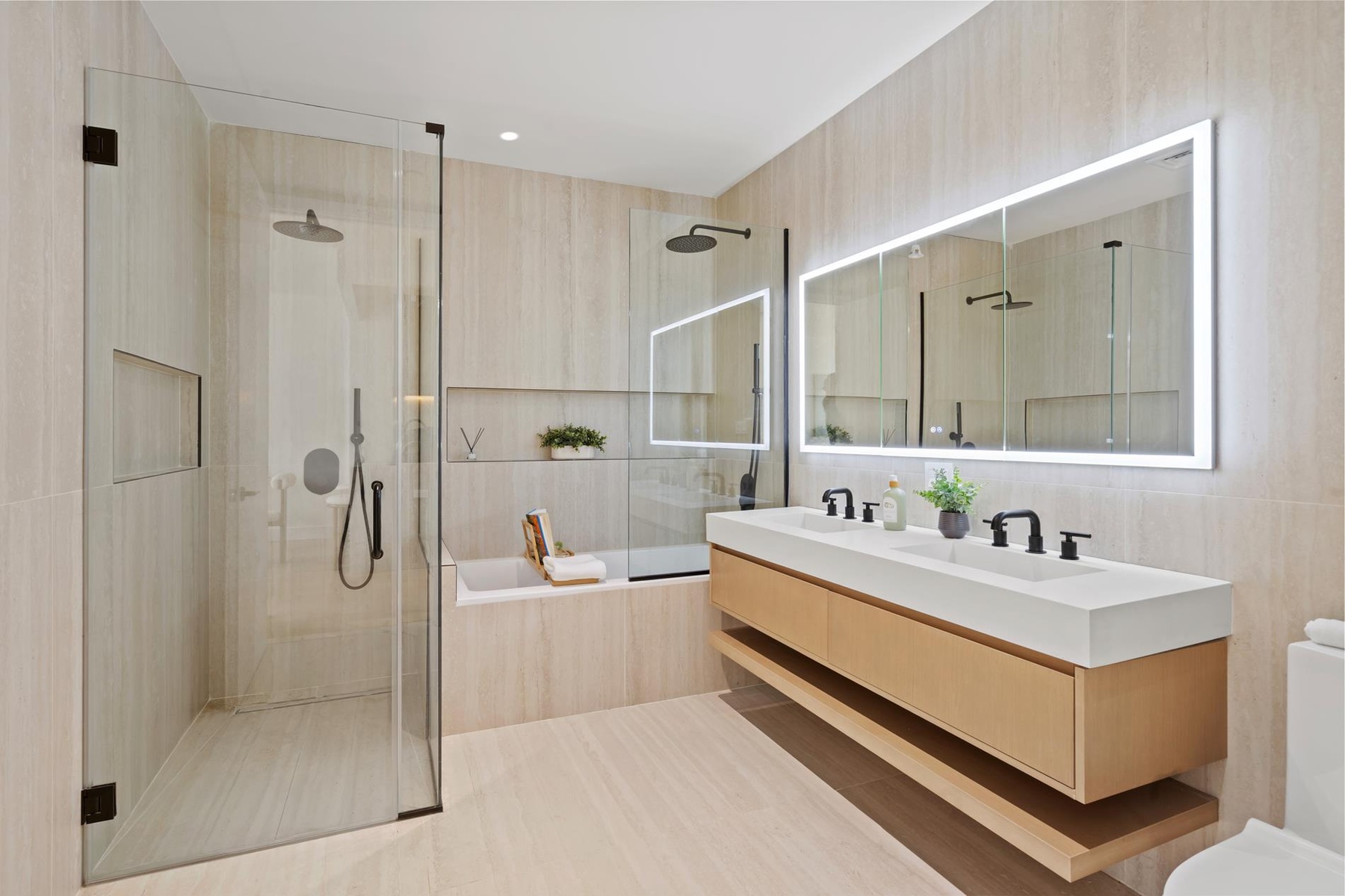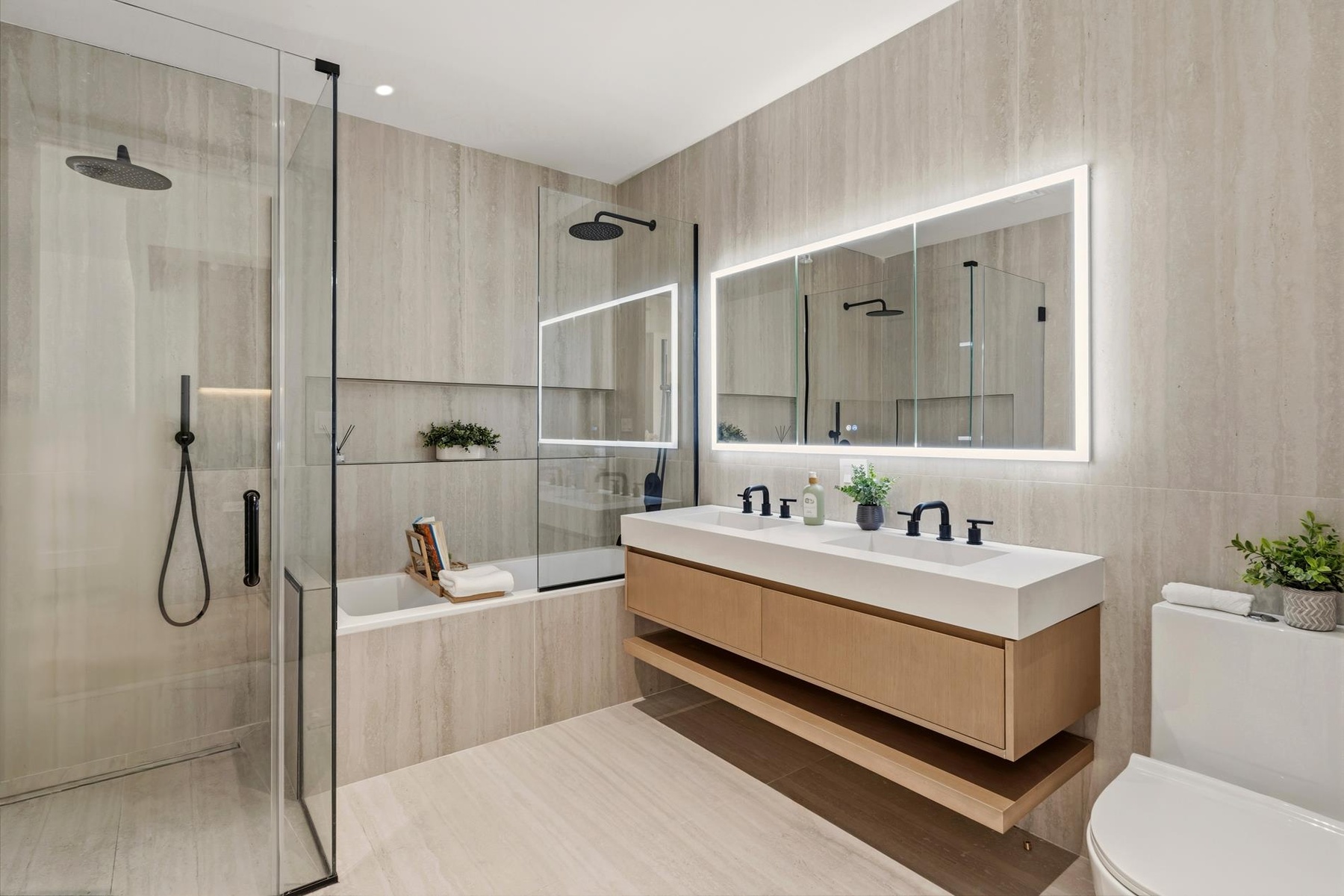 The bedroom features an imported walk-in closet and adjoins a majestic full bathroom with a custom double vanity, high-tech smart mirrors, chic European fixtures, a custom step-in shower, and a deep soaking tub. Additional highlights include custom recessed lighting, a built-in Bluetooth speaker system, ducted heating and cooling, and an in-unit washer with a vented dryer.