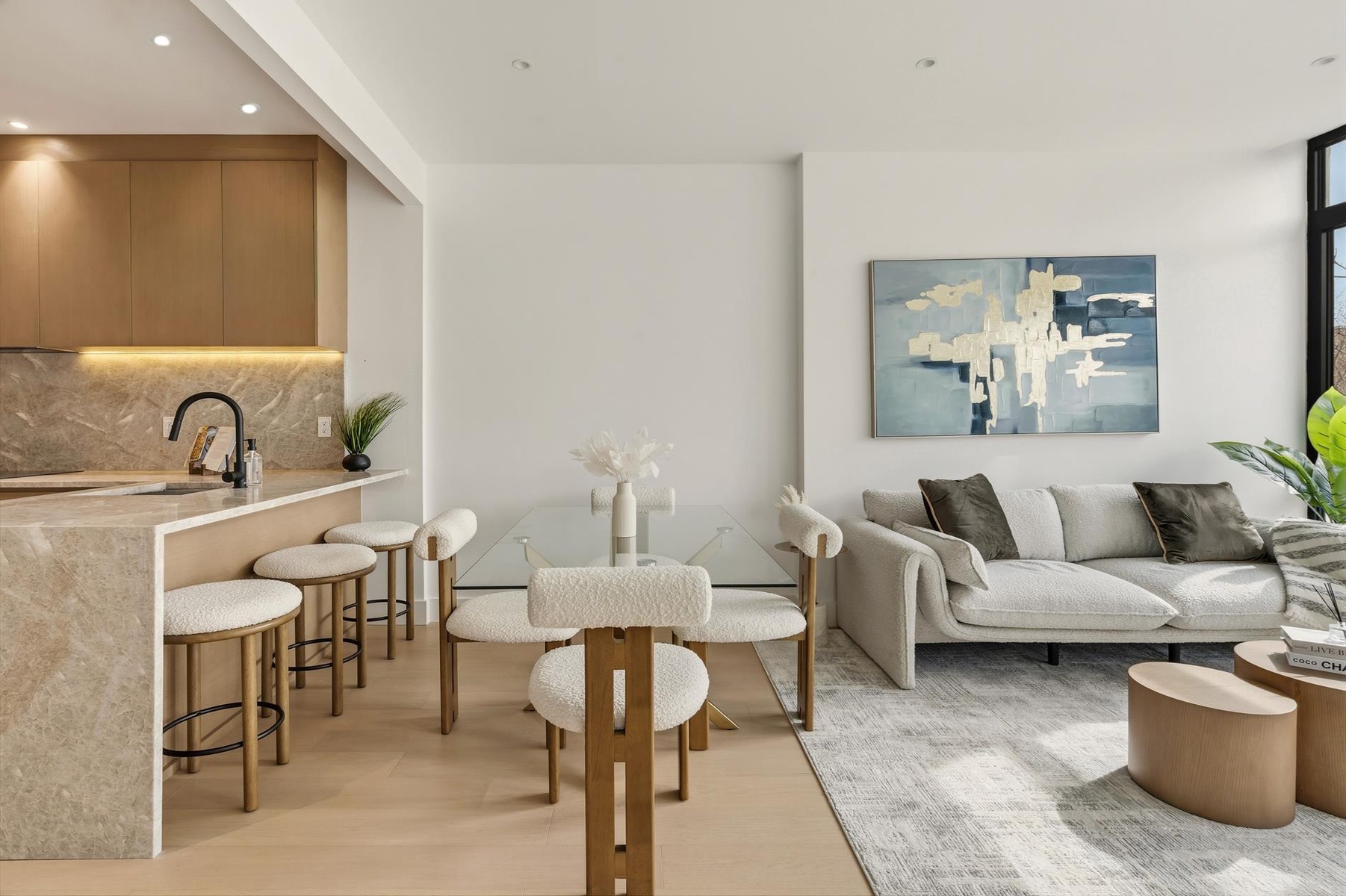 Natural light pours through floor-to-ceiling, double-paned European aluminum windows, accentuating an open-concept layout with solid 7-inch engineered prefinished white oak floors with an acoustic underlayer. A dedicated office is ideal for work-from-home lifestyles, while a private terrace facilitates seamless indoor-outdoor living.
