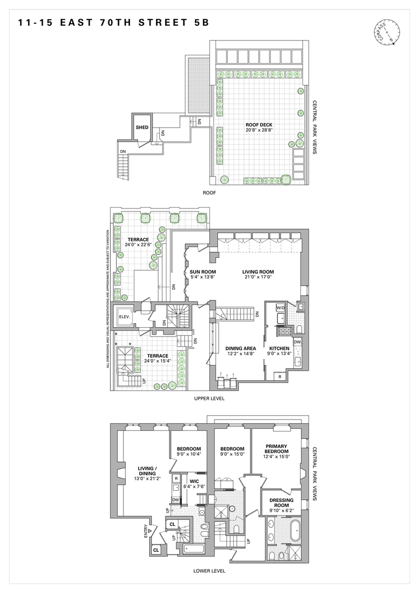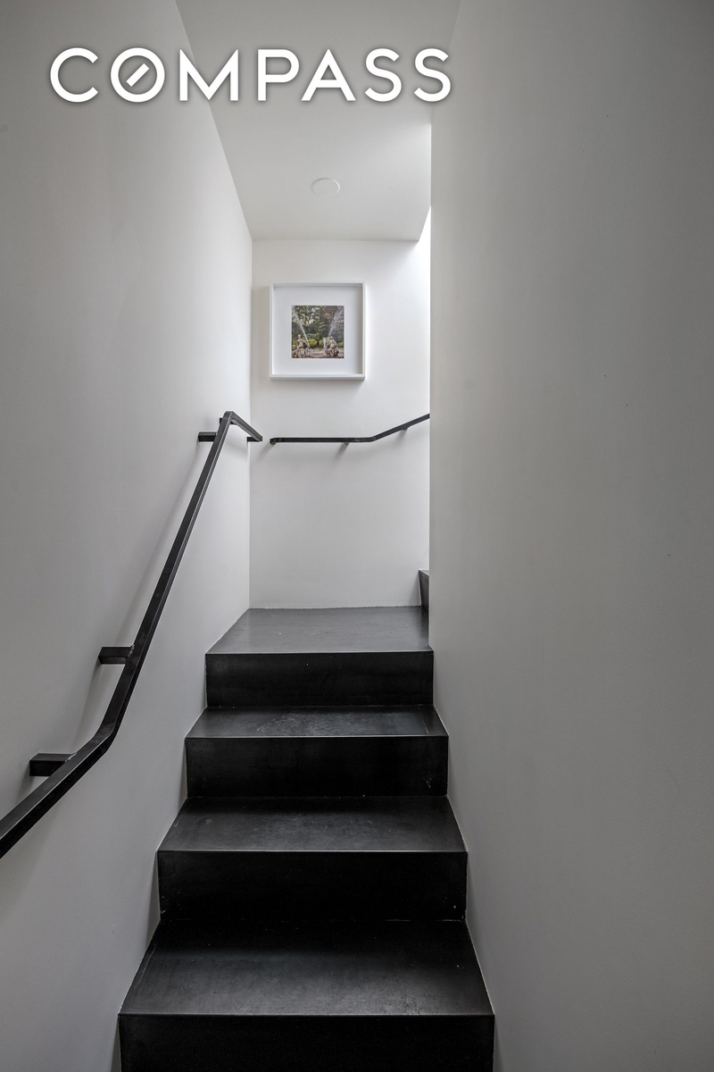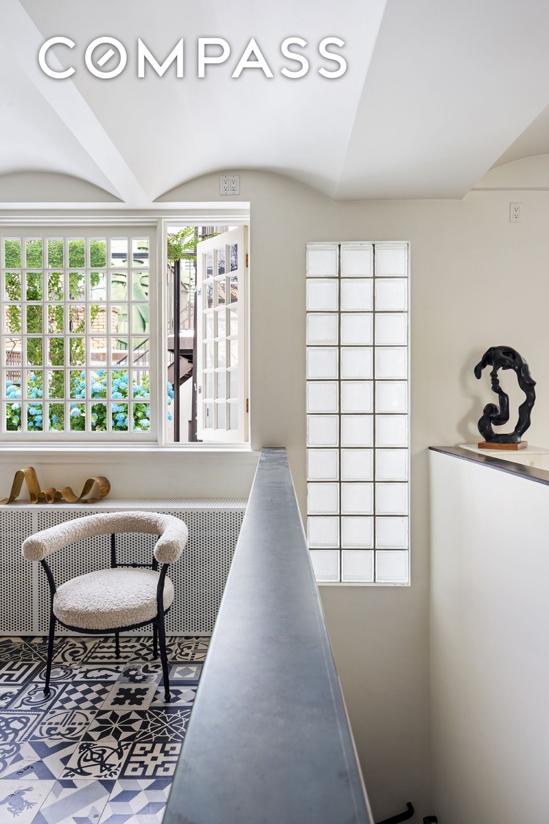 The upper level is complete with a laundry room off the kitchen, angled skylights, a convenient powder room and clever built-in storage throughout. The terrace spans the full length of the fifth floor, currently designed to comprise two intimate seating areas, bisected by the stairs leading up to the crown jewel of this home-- a private, ~575 SF roof deck looking over the newly-renovated Frick Collection gardens and Central Park beyond.