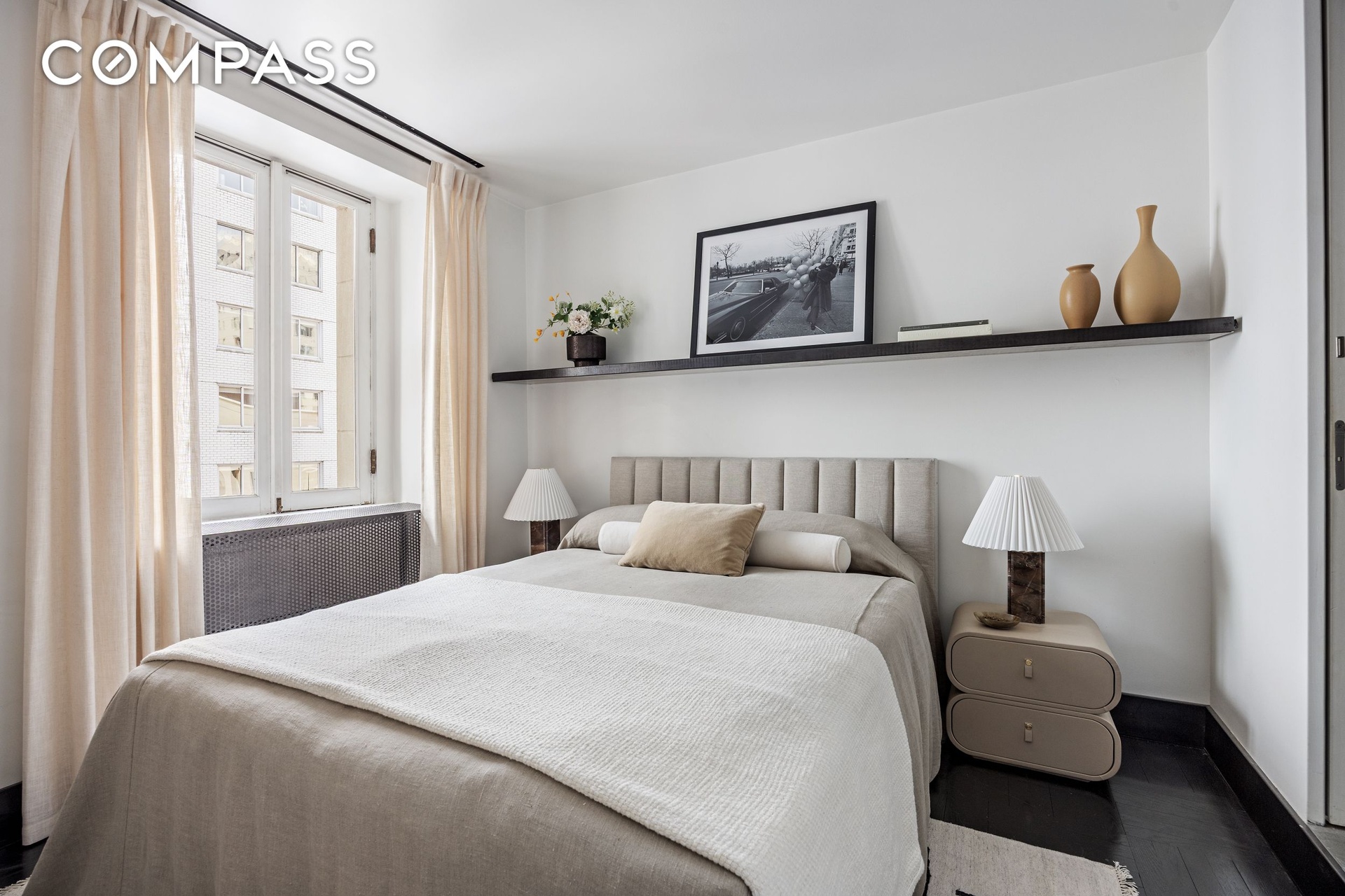 Upon exiting the elevator, enter the primary residence via a stately, fifth floor foyer complete with classic checkerboard tiles. To your left, a set of stairs leads you immediately to the upper-level living/ dining space. Past the staircase, you'll find the private living quarters with two bedrooms, each with an ensuite bath. A king-sized, corner primary suite is complete with high ceilings, decorative fireplace, a luxurious six-fixture ensuite bathroom, and an oversized, windowed dressing area overlooking the Frick gardens. The secondary bedroom also boasts high ceilings, Southern exposure and a design-forward ensuite bathroom.
