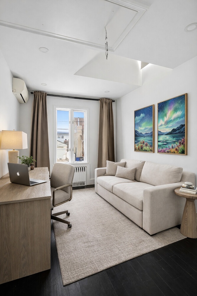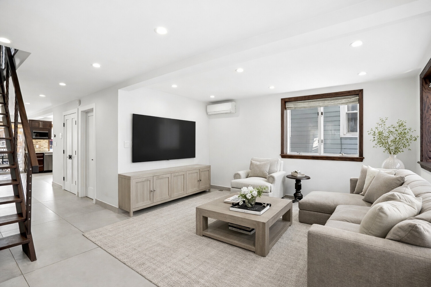 The main level features a bright open living and dining space finished with Italian tile flooring and two-zone radiant heat throughout, creating a warm and comfortable environment year-round. Large Anderson windows bring in natural light, while split-system air conditioning, cast iron radiators, Nest thermostats, and dimmable lighting provide additional comfort and control. Electric window treatments are installed on the first floor for added convenience.