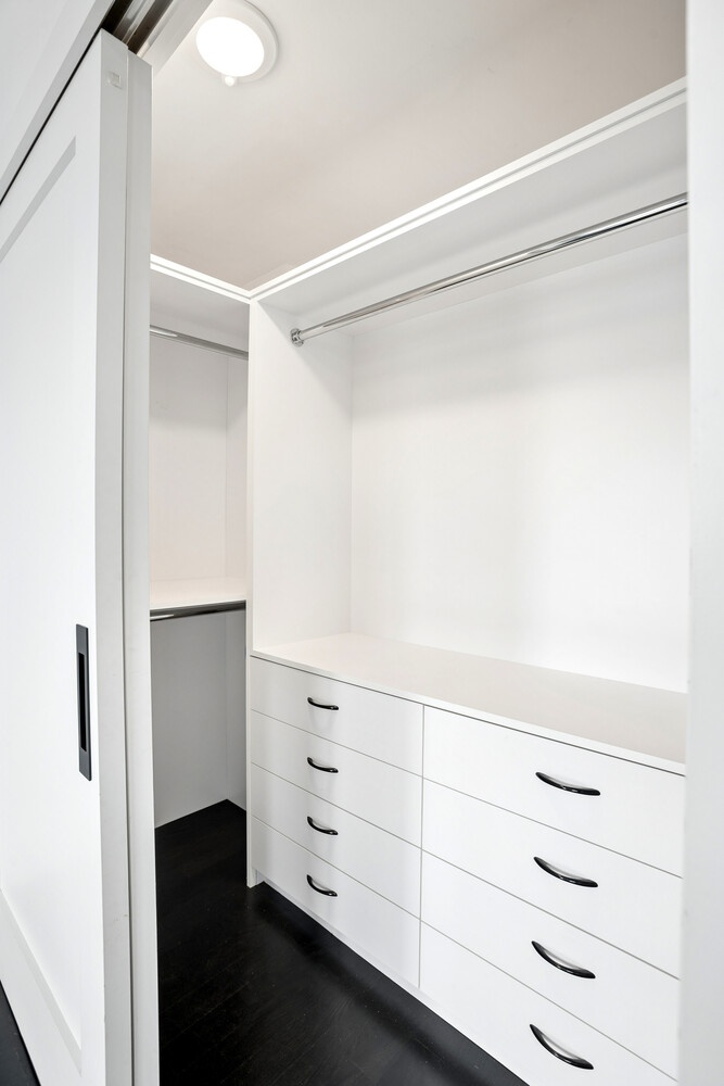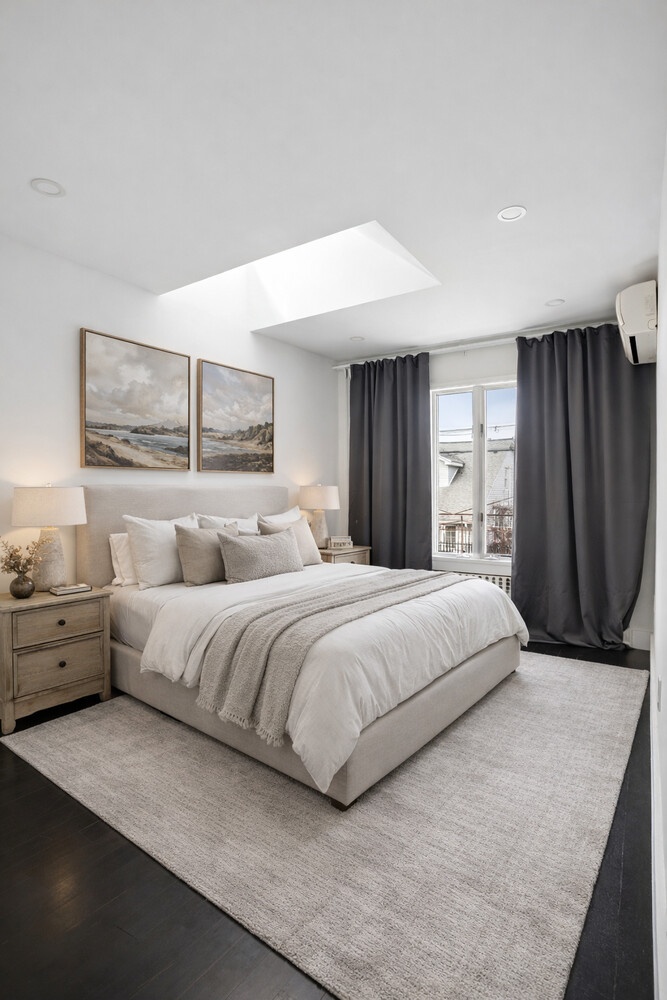 A custom marine-grade Sapelli wood staircase leads to the second floor, where three sun-filled bedrooms are enhanced by skylights and large windows. The second floor features painted Brazilian cherry wood floors throughout.