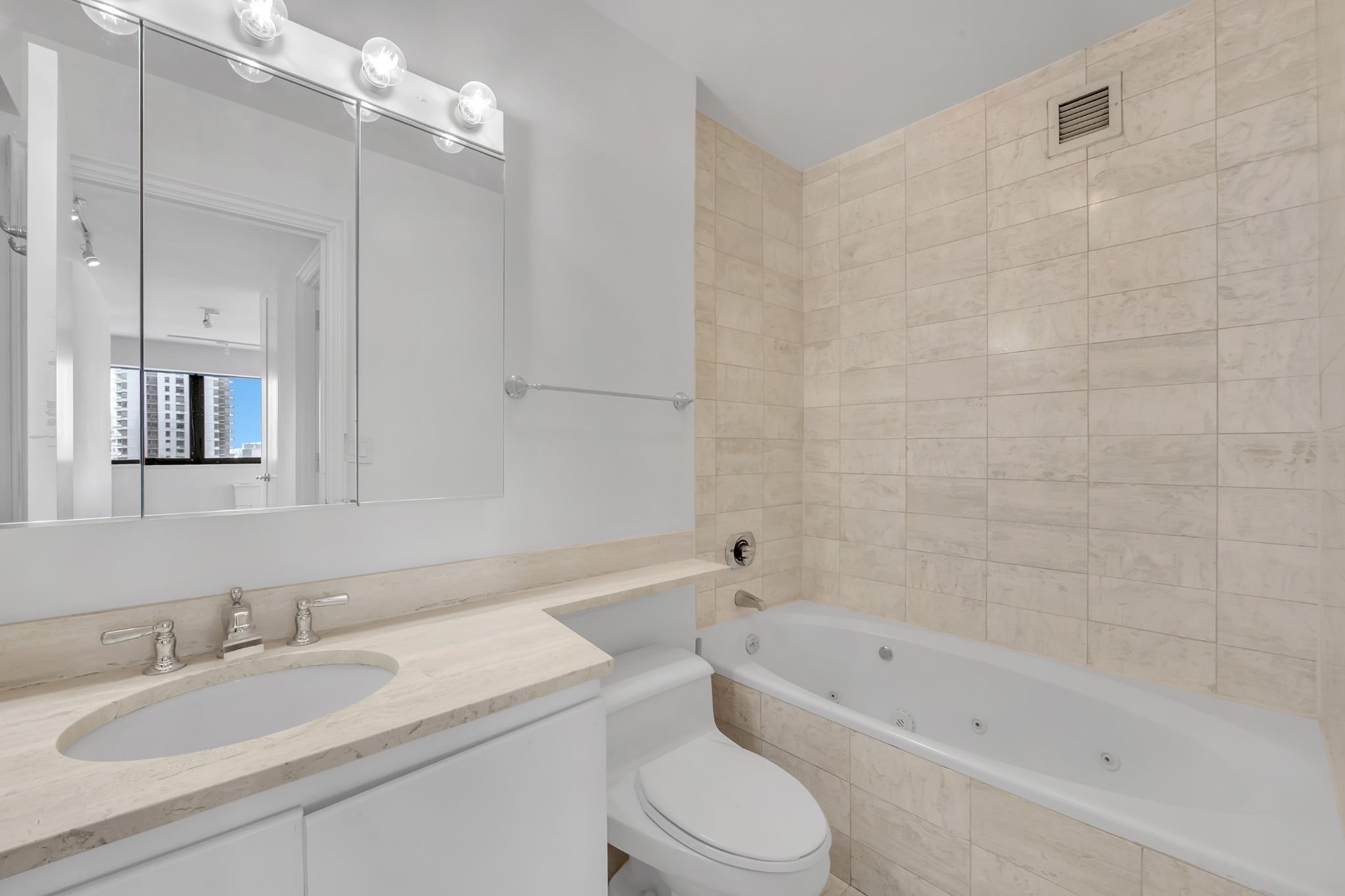 The king-size bedroom features dual north-facing picture windows overlooking 61st Street, offering tranquil views and abundant light. The spa-inspired marble bathroom is appointed with both a stall shower and a separate Jacuzzi soaking tub-a rare luxury in the category. Generous closet space throughout ensures storage is never a concern. Pets welcome.