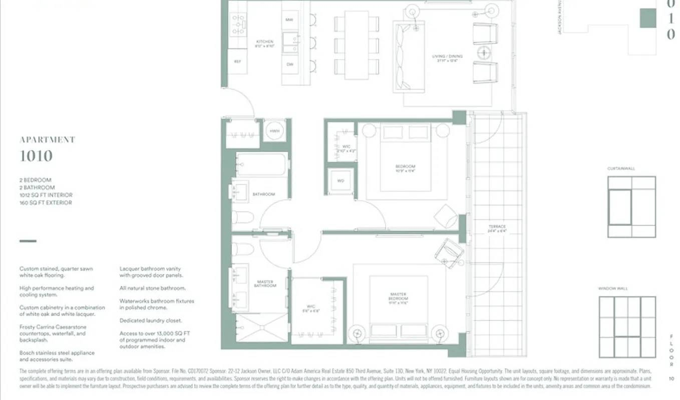 Looking out from the 10th floor of GALERIE this well-appointed two-bedroom, two bath home is thoughtfully planned. The southern exposures in the generous living room afford the space abundant light through floor to ceiling window walls and the grand terrace off the living area and master bedroom is perfect for entertaining. The master suite is graciously appointed with a walk-in closet and spa-like master bath. The interior design of this expansive residence is seamlessly modern, with the clean lines of the custom oak flooring and a neutral palette that nevertheless contains a variety of sophisticated details. The workmanship is superior, with materials and finishes that are modern and sublime. Airy and open, the interiors anticipate owners who appreciate a space that can be easily decorated to reflect their personal point-of-view.