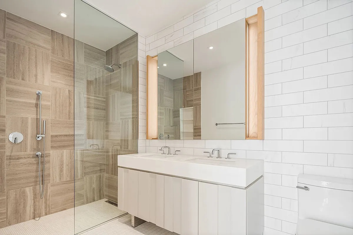 Seamlessly integrated with the living space, high design and precision woodwork express the quality of the kitchens. The dining island features a Caesarstone countertop and waterfall edge detail. Sophisticated matte white oak millwork is complemented with bright white lacquer cabinets. A suite of stainless-steel Bosch appliances and LED lighting completes the package. The master bath is an artistic sanctuary with custom dual-sink lacquer cabinetry and distinctive Zebra-Mink marble wall tiles and accents. Glazed ceramic tiled walls with Maku Light in a herringbone pattern make the secondary baths an unexpected luxury. All bathrooms include polished Waterworks fixtures.