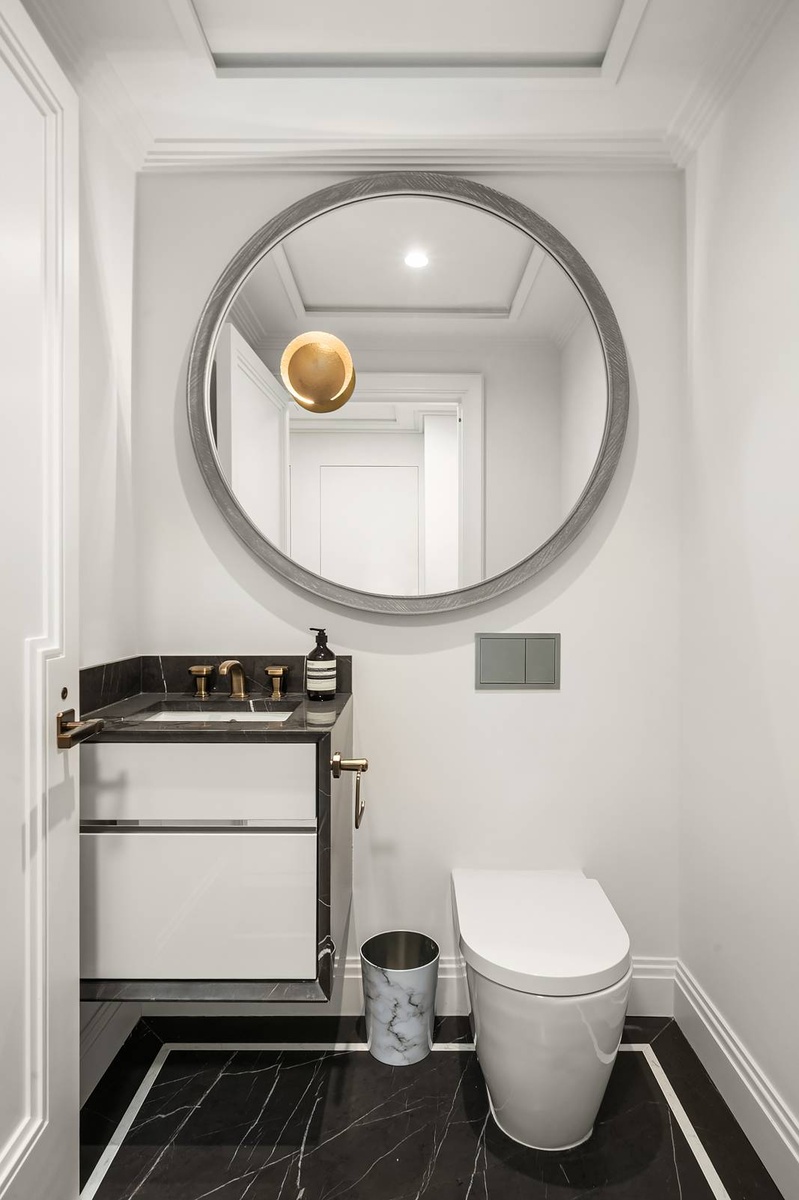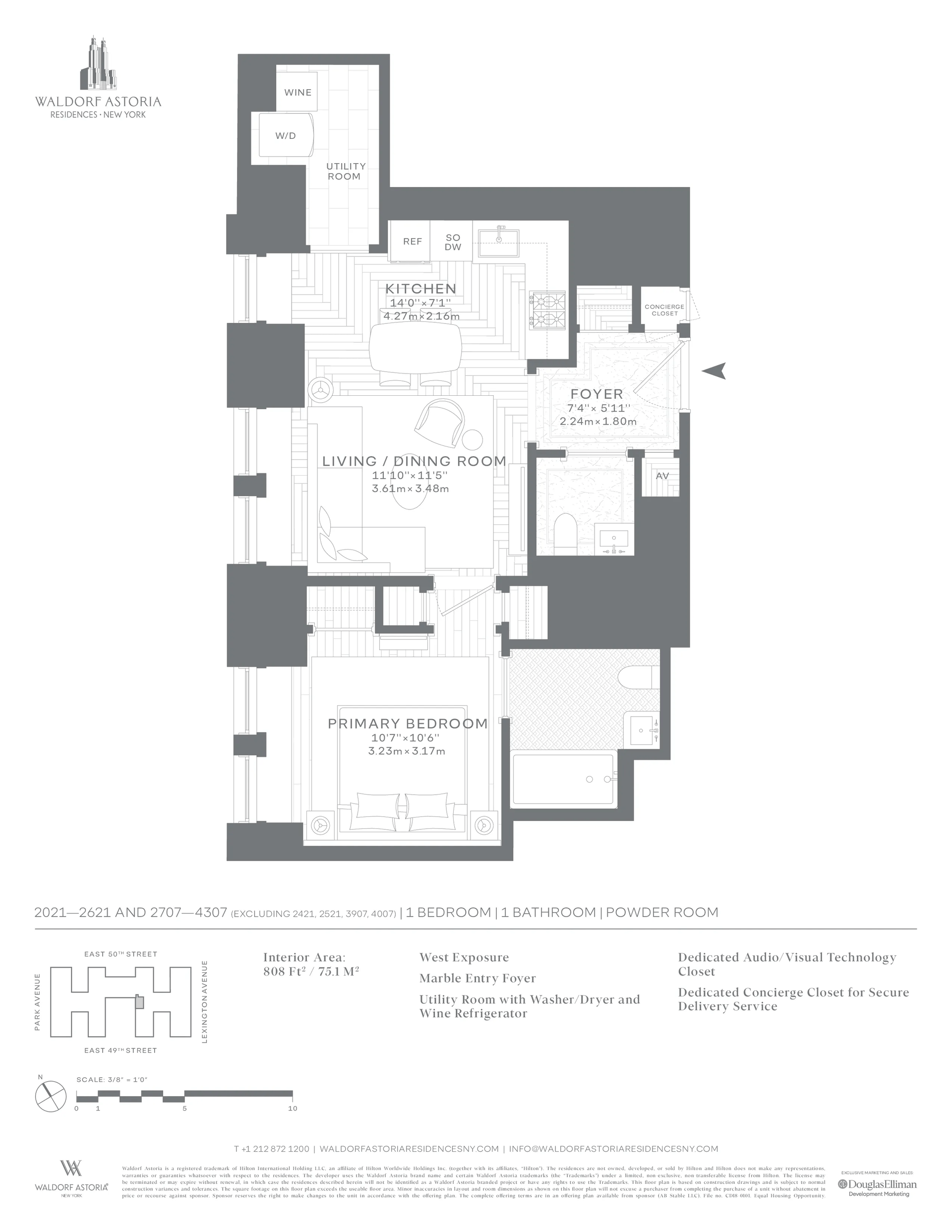 Interior features: Living space is designed to maximize natural light and city views with high ceilings and sound attenuating windows for privacy. The kitchen features wood and lacquer cabinetry custom-designed by Deniot and fabricated by Molteni&C, cleverly concealing a top-of-the-line appliance suite by Gaggenau that includes a five- burner gas cooktop with oven and fully vented range hood, separate refrigerator and freezer, wine refrigerator, speed oven and dishwasher, Polished Quartzite Arabescato backsplash and countertops with beveled edges are enhanced by polished nickel fixtures. The unit boasts of several large walk-in closets ensuring more than ample space for personal belongings as well as an in-unit washer/dryer. The bathroom features floor-to-ceiling honed white Bianca Carrara marble slab walls and radiant heated custom designed mosaic marble tile floor. A custom vanity with polished Luna Gray marble countertop, and integrated lighting provides exceptional storage complementing the cabinet with integrated lighting, mirror and concealed electric outlet. The bathroom offers an oversized rain shower.