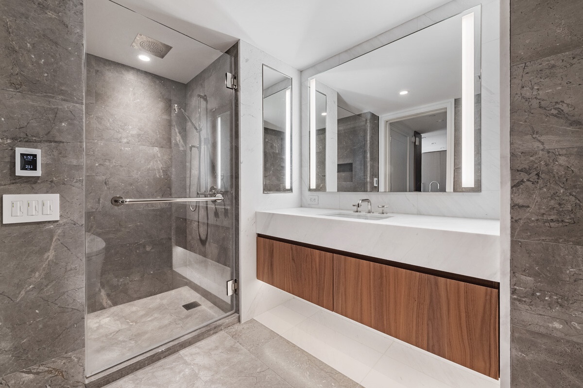 Beyond the living room is the bedroom with enough space for a king size bed, two closets, and floor-to-ceiling windows with the same southern city view. The spa-like bathroom is a retreat with Greek Bianco Dolomiti stone vanity and backsplash, Turkish Fiore di Bosco stone walls and flooring, and polished nickel Waterworks fixtures. Each residence offers comfort and convenience with the inclusion of a Miele washer and ventless dryer and zoned climate control for year-round control.