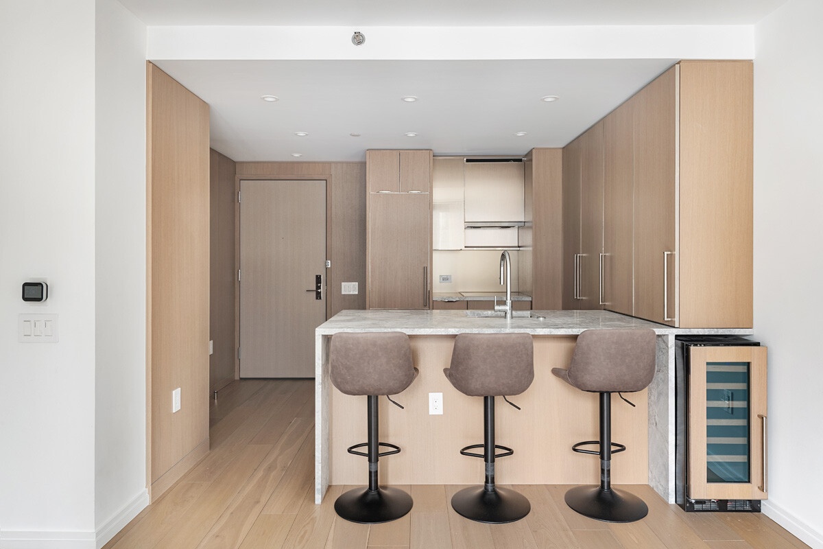 The home opens to a well appointed kitchen featuring super-white quartzite countertop and waterfall island, bronze and tinted mirror glass backsplash, and a wall of white oak cabinetry and pantry providing ample storage. A marvel wine refrigerator stylishly complements the elegant Miele appliance package. The kitchen leads into an airy living room with floor-to-ceiling windows that frame the southern view of the city.