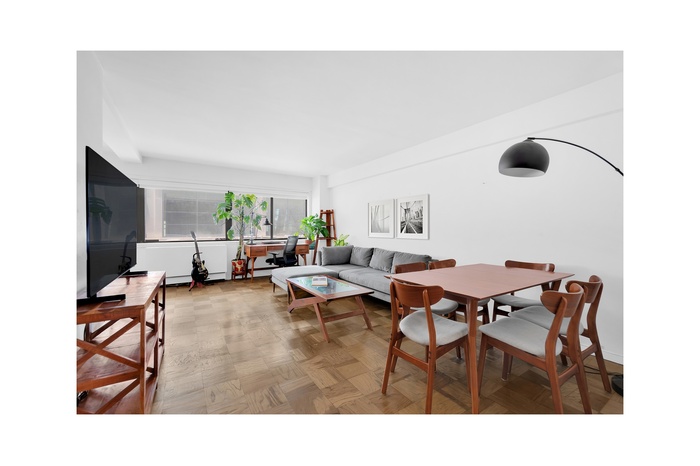 Handsome mid-century modern furnishings include a dining table that seats six. The sleeping area, tucked to the side, accommodates a queen-sized bed and accompanying nightstands. The bathroom, which has a separate sink and closet area, has a newly reglazed tub and sink. Hardwood parquet floors lend warmth to the space.