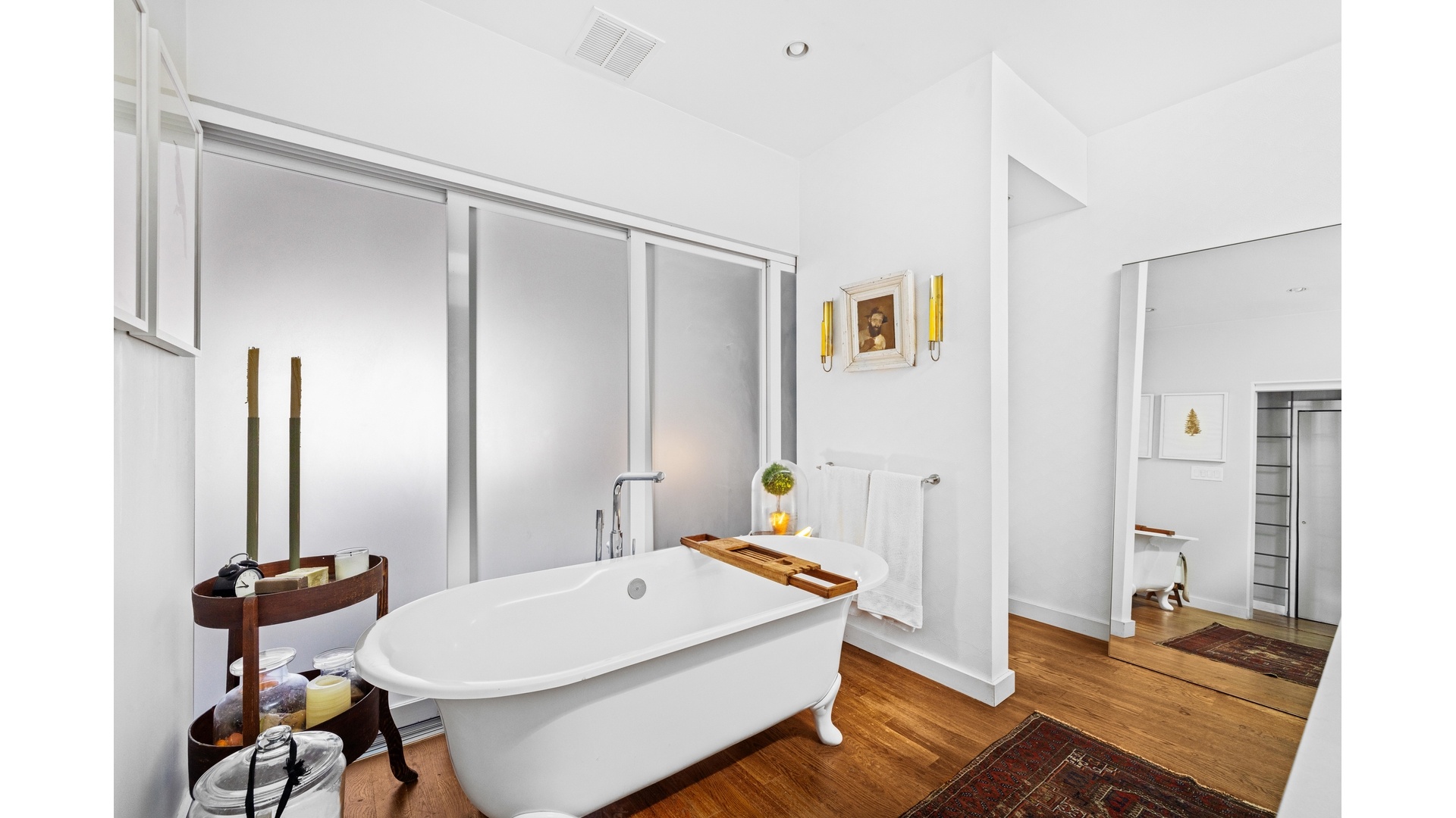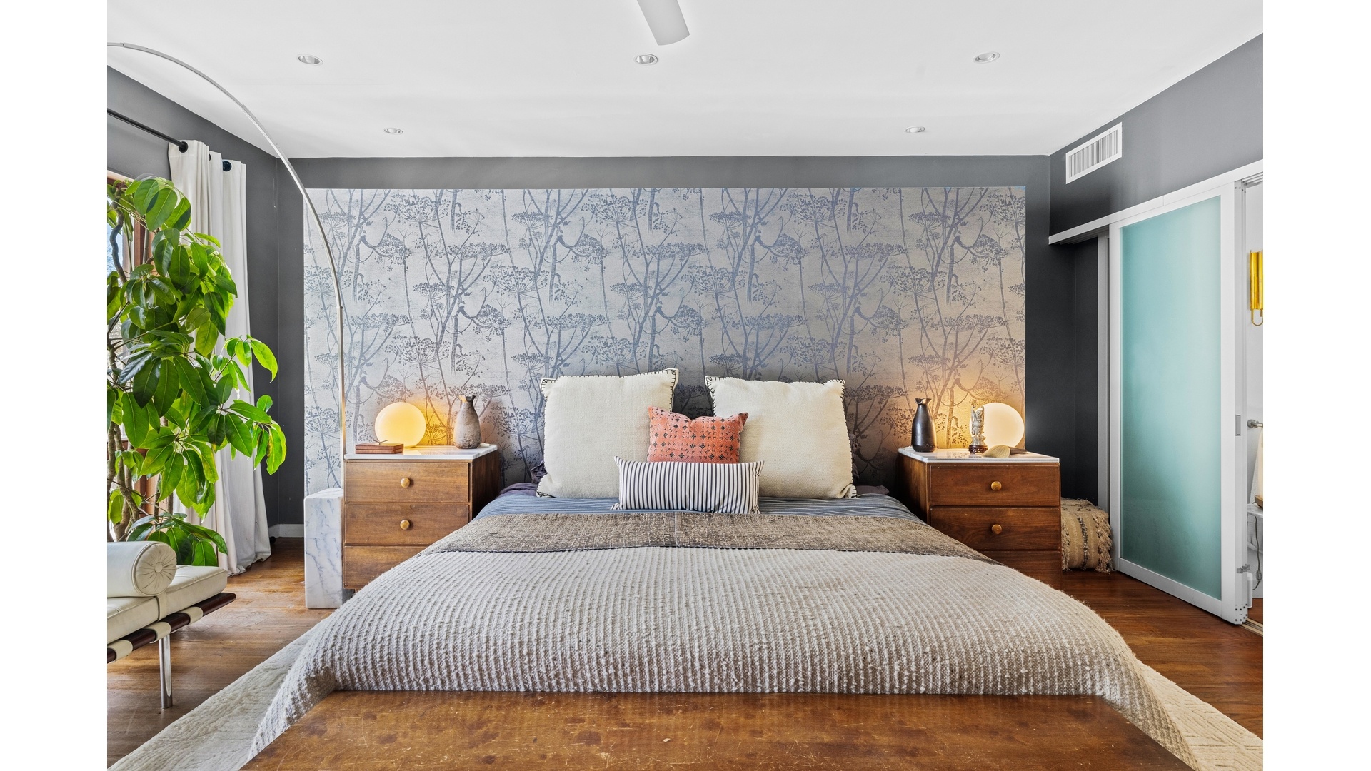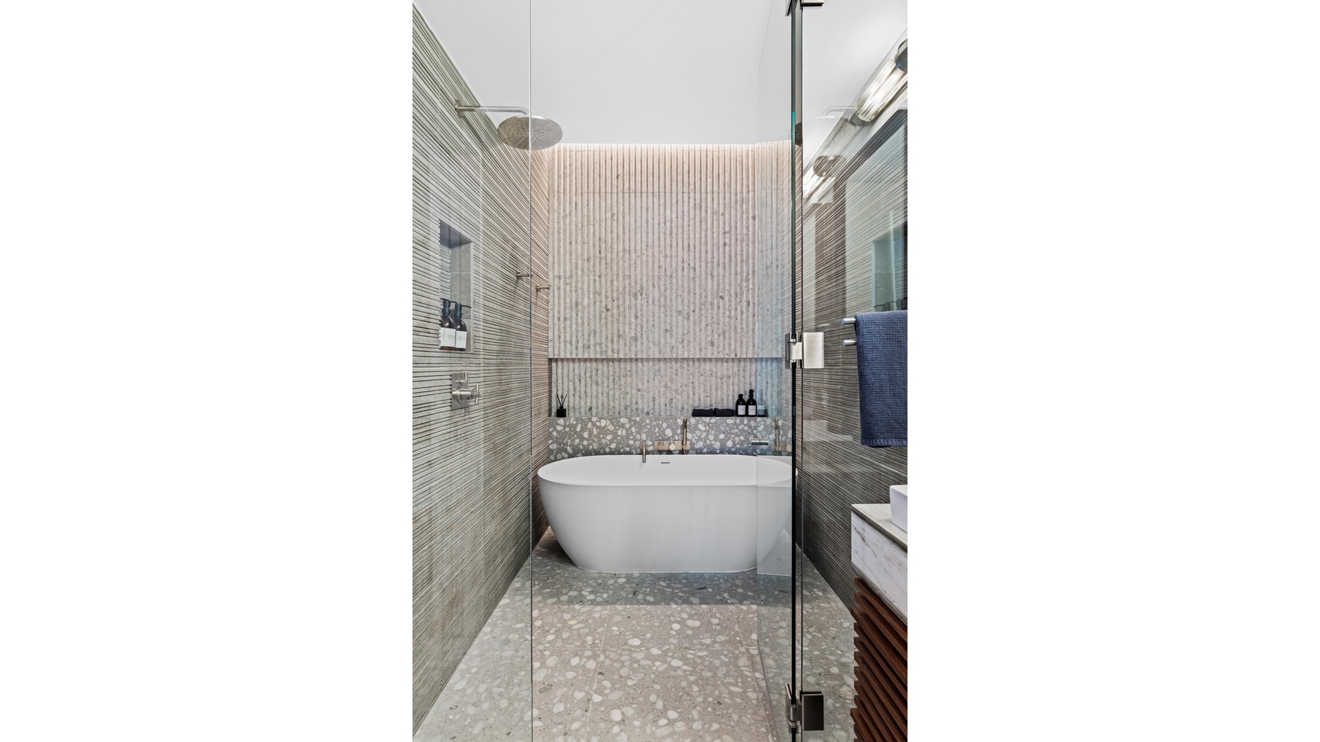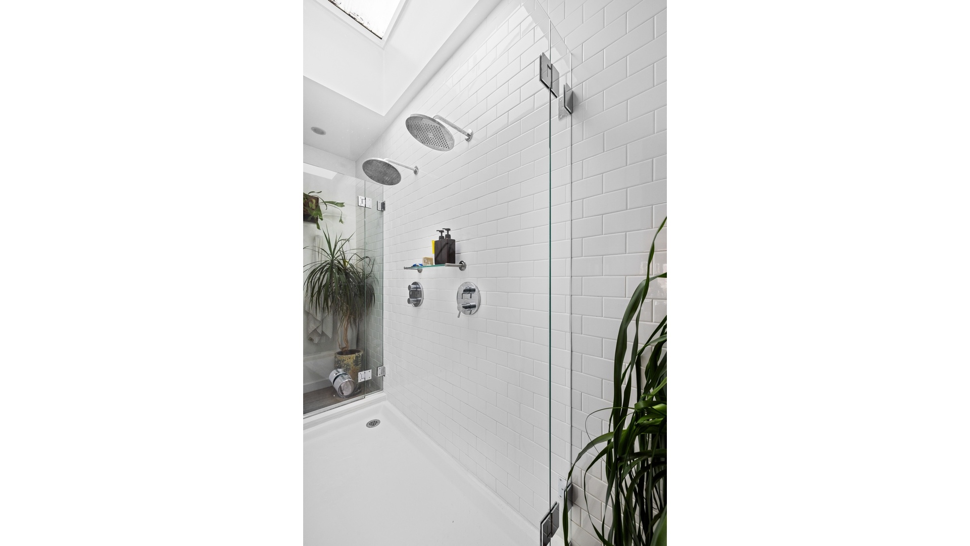 The Top-Floor Retreat: The crowning jewel is the top-floor primary suite, where the bathroom opens seamlessly to the bedroom via sliding frosted glass doors. This sanctuary features a spectacular double shower situated directly beneath a skylight, creating an unparalleled bathing experience.
