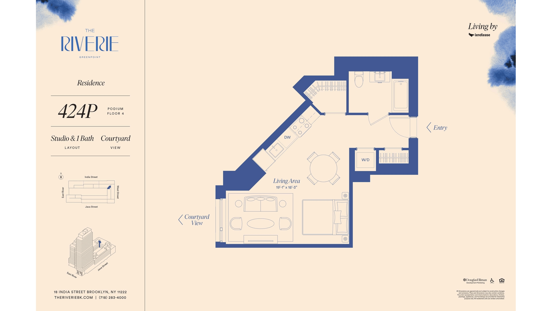 Anchored to the banks of the East River, The Riverie rises as a new beacon of serene riverside living and accessibility, with direct access to Manhattan by ferry at the India Street Pier. Elegant, light-filled studio to three-bedroom residences offer exceptional, sweeping skyline views of Manhattan, Brooklyn, and the riverfront. The building pairs refined design and natural beauty with sustainable innovation, including net-zero carbon operations and New York's largest geothermal residential system.