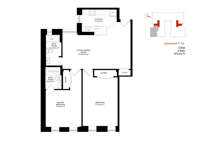 Both bedrooms are spacious and bright with private closet space. The bathroom features large format tiles, matte black fixtures, a custom wood veneer vanity, and a deep tub. A stacked in-unit washer/dryer is a convenient finishing touch.