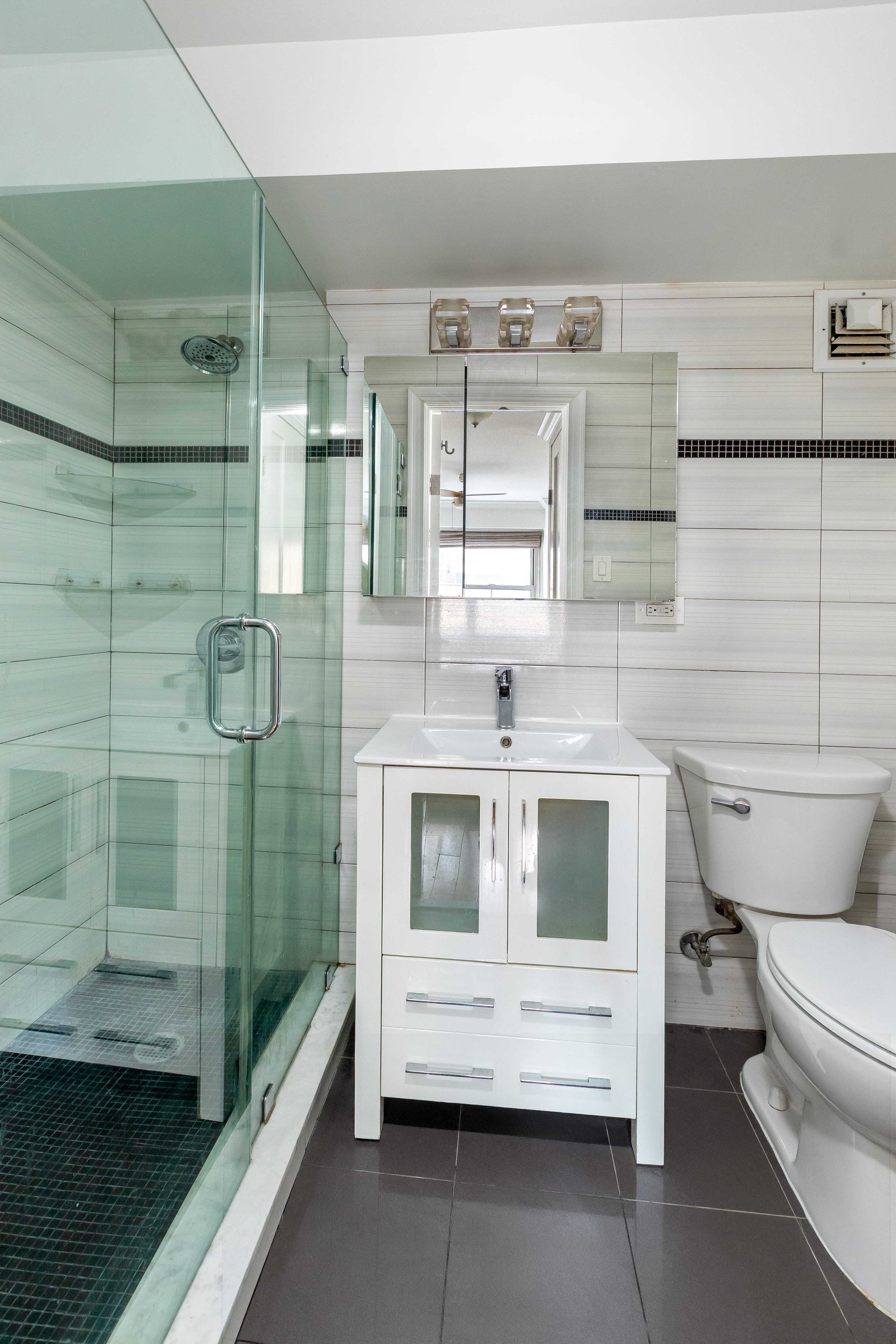This spacious one-bedroom home has been thoughtfully renovated and features a new open kitchen with Carrera granite countertops, a breakfast bar, and full-size stainless steel appliances. The expansive dining and living area is light-filled and airy, enhanced by solid hardwood floors, crown moldings, and recessed lighting. The bedroom comfortably accommodates a queen-size bed with space for additional furnishings, while the renovated bathroom showcases floor-to-ceiling tile and a custom glass shower enclosure. Ample closet space throughout ensures easy organization and functionality.