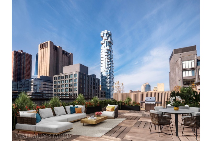 This stunning one-of-a-kind prewar penthouse has been meticulously renovated down to the studs, seamlessly blending enchanting turn-of-the-century detail with modern luxury. Every room is bathed in stunning southern light with open downtown views. Upon entering, you'll find a fully fitted, double-sized coat closet across from an attractive marble-topped home office space with opaque shelving. A solid spiral staircase ascends to the upper-level greenhouse lounge, a unique and charming feature of this home. The kitchen is a chef's dream, showcasing preserved turn-of-the-century tile and terrazzo flooring, bathed in natural light from a large skylight above. Anchored by a central island that extends to an opaque built-in dining table, this exceptional space is equipped with state-of-the-art appliances and fixtures. This includes a huge subzero refrigerator, a full-sized wine fridge, and a vented 4-burner Wolfe stove with grill and pot filler. Additional highlights include a built-in microwave drawer, a Miele dishwasher, a Miele stack washer and dryer, a deep farm sink, and abundant sleek cabinetry. The expansive double-wide living and dining room features 10.5-foot ceilings and an oversized, wood framed wall of windows facing south. Wide plank, hand-laid oak hardwood flooring and restored, low-profile cast iron radiators designed with charming turn-of-the-century detail complement the space. The primary bedroom is an inviting retreat with oversized, south facing wood framed windows, fully fitted dressing closets and stunning en-suite spa bath. The bathroom is equipped with an oversized skylit walk-in shower, marble tiled walls, radiant heat flooring, and high end Duravit and Kohler fixtures. The spacious second bedroom is equally charming, with southern exposures through oversized windows. The pristine second bathroom features radiant-heat flooring and premium Duravit and Kohler fixtures. A beautifully crafted, wide spiral staircase leads to the rooftop greenhouse lounge, which opens onto a sprawling 1,200 square foot roof deck. This exceptional outdoor space is outfitted with fire-retardant wood pallets on a pedestal system that steps down to a slate-covered lower deck, perfect for a barbecue setup. With ample room for outdoor living, the rooftop offers endless possibilities to create your own Shangri la. 366 Broadway was built in 1908 as a commercial Beaux-Arts building which once housed the headquarters of the Royal Typewriter Company and was later home to multiple textile firms. In 1979, it was converted into co-operative apartments named Collect Pond House, in honor of the historic body of fresh water that stood in the area and supplied New York City from the 17th to the early 19th century. Recently renovated and restored to its original glory, The Collect Pond House has an extraordinary lobby with double-height ceilings, marble walls, and a grand wrought iron staircase with elaborate decorative grill work. Both elevators have been recently replaced and every unit comes with a sizable storage cage. The co-op has installed key fob automated entrance doors, a video security system, and has an exceptional full-time super and porter. 70% financing, trust ownership and pets are allowed. Pied a terres and guarantors are not allowed.