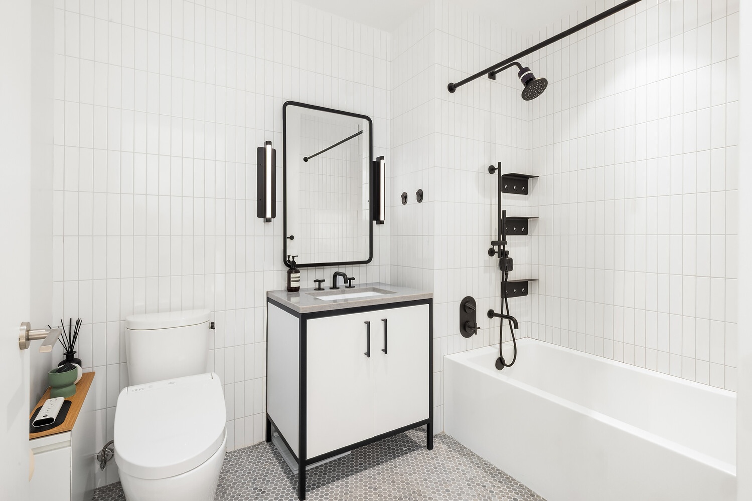 The luxurious bathroom features spa-like elements, including penny-round marble tiles and a deep soaking tub, offering a serene retreat.