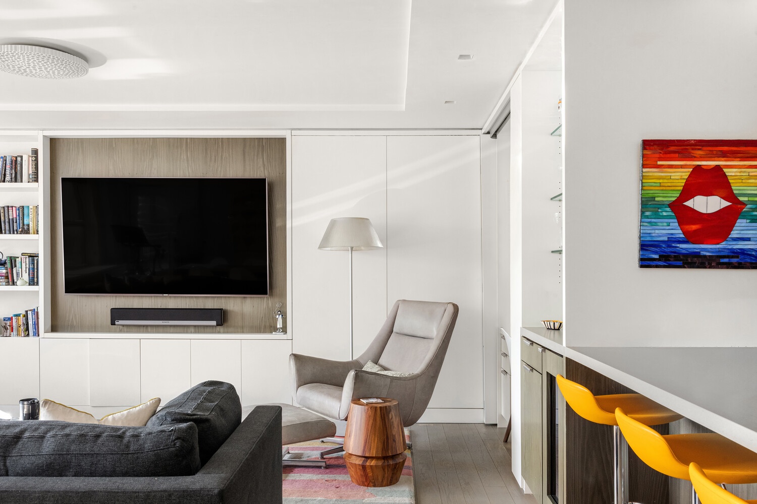 The layout is fantastic. A large living and dining room with custom cabinetry gives you real space to lounge and entertain, and it opens directly to a renovated 36 foot long private terrace. The terrace is large enough for dining, lounging, and plants, and includes a dedicated outdoor storage shed big enough to store bicycles. Off the living area, there is also a built in desk nook, well suited for work or homework, and a bar with wine fridge.