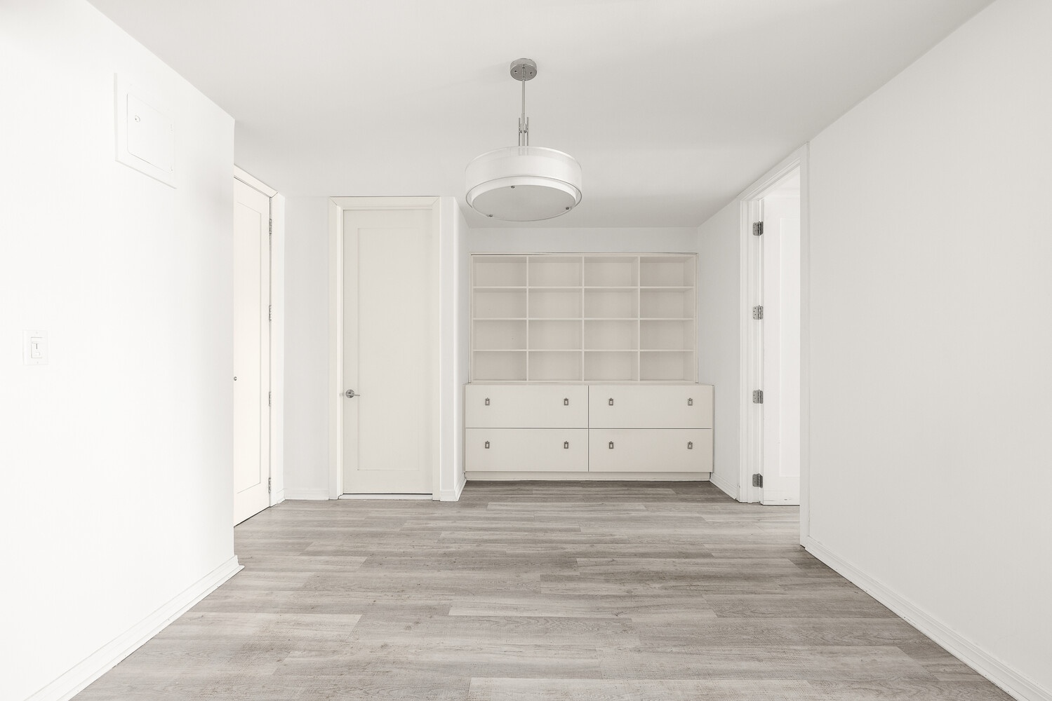 Off the kitchen is a large bonus space with custom shelves that can flex as a grand entry hall, a separate dining area, a library, or a home office. The bedroom can accommodate a king-size bed and includes a pair of deep reach-in closets, while the bathroom has marble-tiled walls, an oversized medicine cabinet, and a luxurious walk-in shower. Installation of a washer and dryer is possible with Board approval.