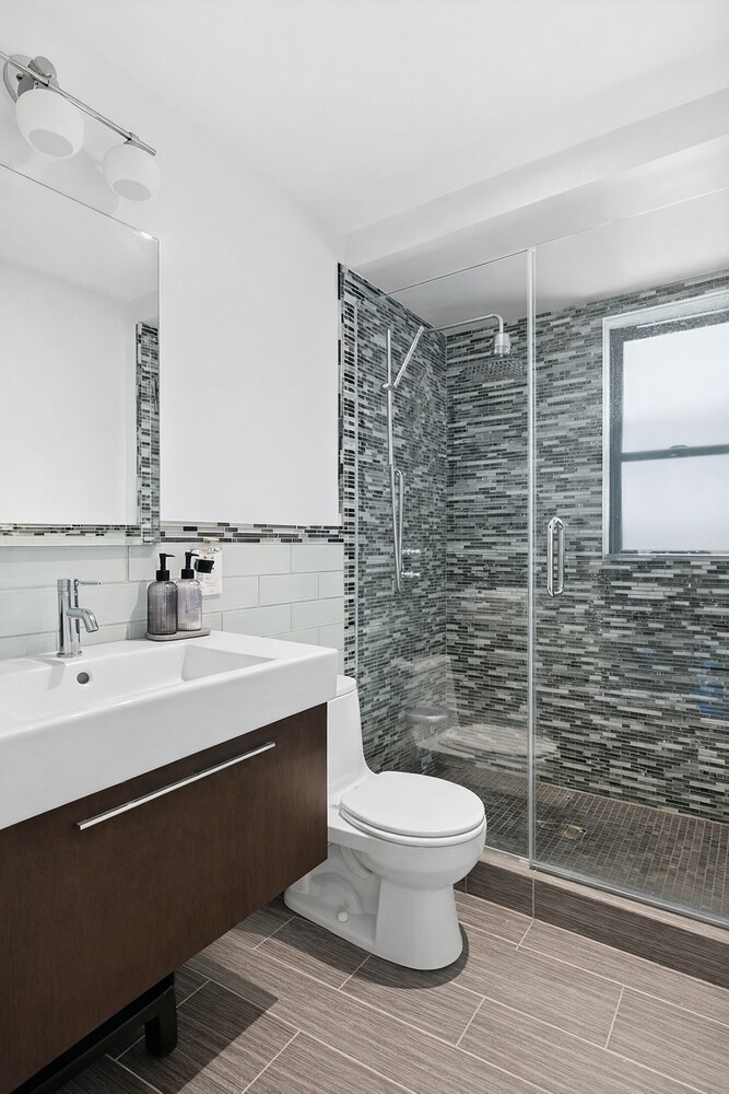 The bedroom sits at the opposite end of the apartment for privacy. It is spacious and quiet, also featuring a full row of windows and excellent closet space, with room for a large bed and additional furnishings. Just off the hallway, the windowed bathroom has been fully renovated with glass subway tile and polished chrome fixtures in a timeless style.