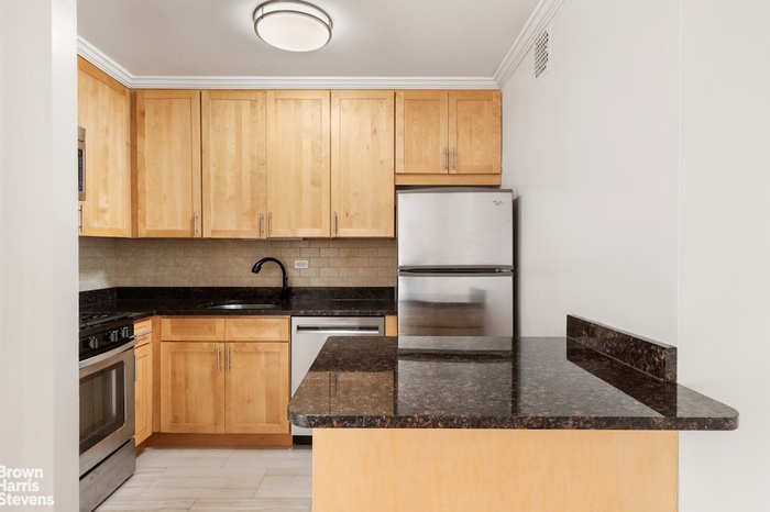 Fabulous, sun-drenched one-bedroom with coveted southwest exposure, filling the home with beautiful natural light throughout the day. The kitchen stands out with light wood cabinetry, striking black granite countertops, and stainless steel appliances. A stylishly updated bathroom features modern tile for a fresh, clean look. Recessed lighting and gleaming hardwood floors add warmth and polish, creating a cozy yet sophisticated feel. Generous closet space makes this home appealing as it is charming.