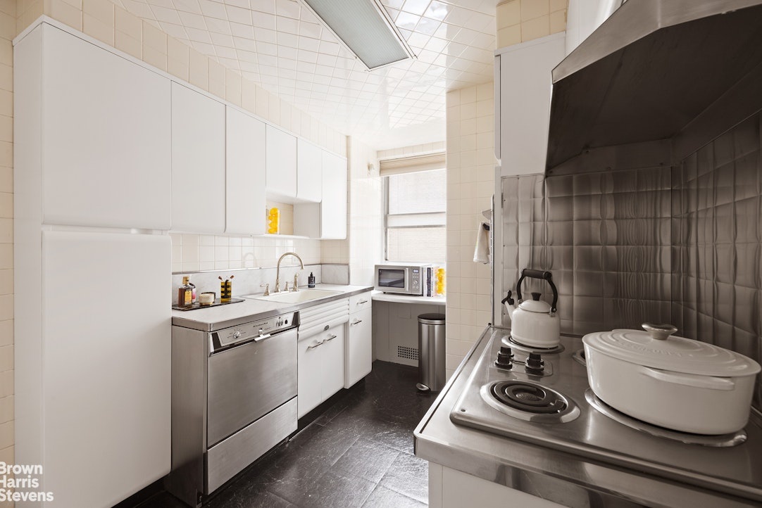 Apartment 9K is bathed in natural light throughout the day and boasts triple exposures, approximately 1,550 square feet, and 9'1" ceilings. Classic views feature iconic townhouses and open city skyline to the south, a glimpse of Central Park to the west, and the Frick Collection to the north. The gracious and efficient layout is ideal for both elegant entertaining and comfortable daily living. A proper entry gallery with two large closets leads to the living room and dining area. The windowed kitchen, adjacent to the dining area, can be easily opened, creating a seamless flow from one room to the next. The bedroom wing is ideally partitioned to the east, offering privacy and tranquility. The primary suite features double exposures, abundant closet space, and an en-suite, windowed bath with soaking tub. The second bedroom, currently configured as a guest suite and den, is well positioned next to the second full bath which is also windowed.
