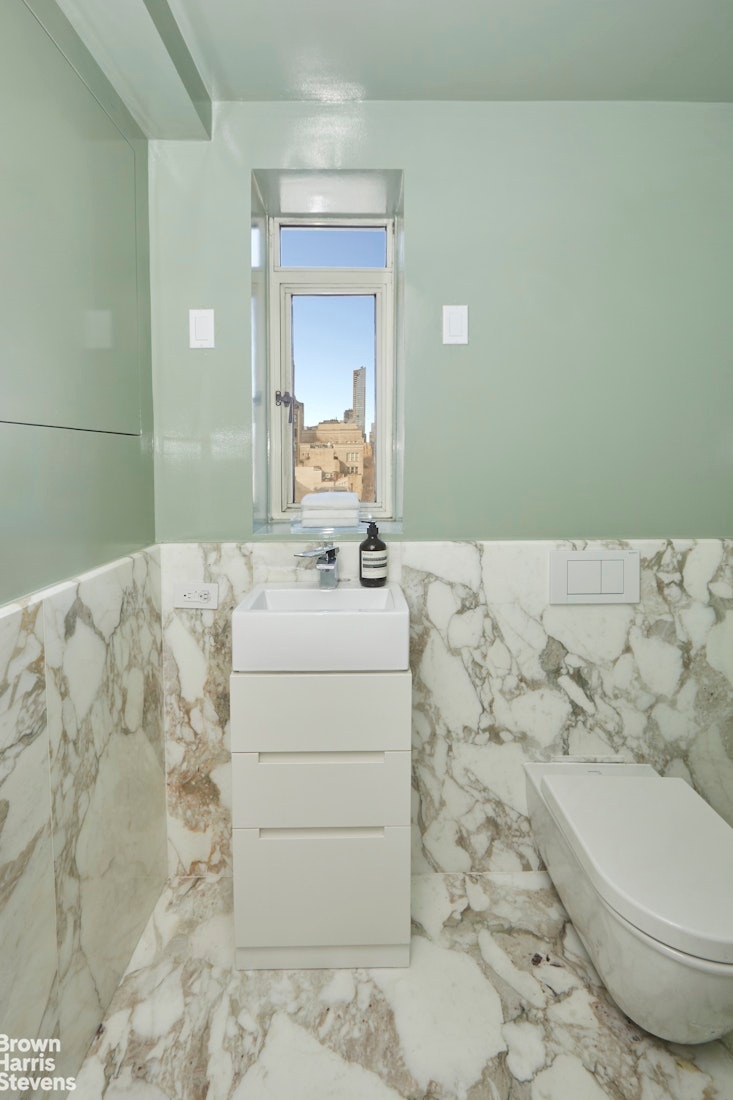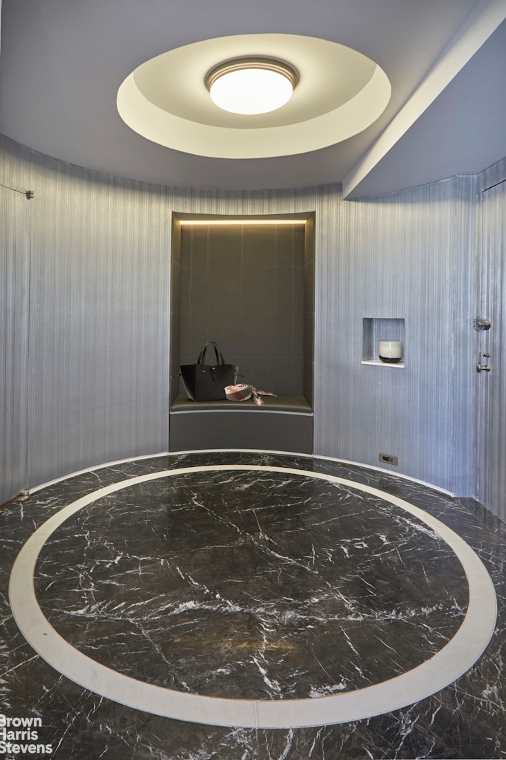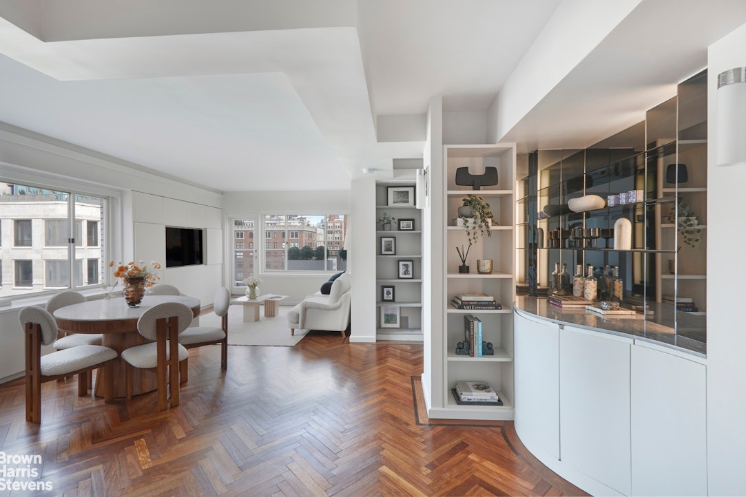The foyer, an ornate hinge-opening trinket has a Cortina leather seating nook with a built in shoe cabinet. The floor is Calacutta marble slab and there is a chic and spacious coat closet. A hallway leads to the sun-drenched corner living room that boasts stunning views through perfect picture windows. The flooring is solid Cumaru herringbone wood throughout, while designer elements include modern base reveal, linear recessed lighting and an elegant bar with wine fridge. The large windowed eat-in kitchen features top-of-the-line Gaggenau and Miele appliances, complete with Kallista sink by Kohler and Blue de Savoie backsplash from the French Alps. The kitchen counters and flooring are Nano Glass Stone. Best of all is the window booth with views of Central Park, the perfect morning coffee spot. There is an adjacent windowed powder room that enjoys the same quintessentially New York scape.